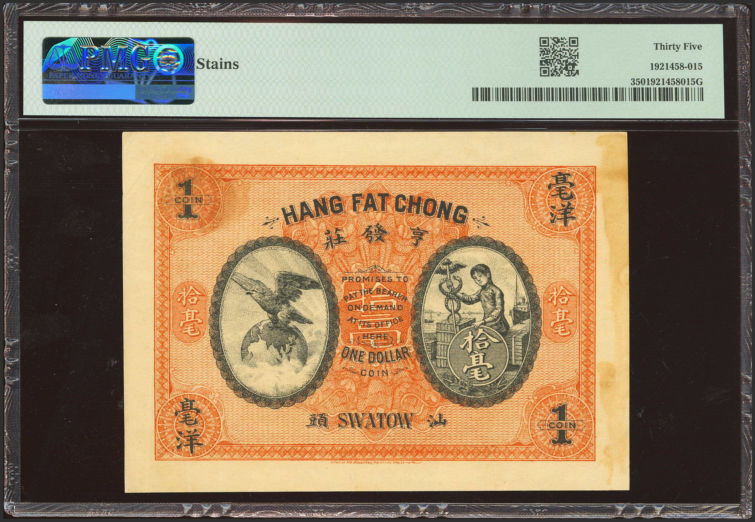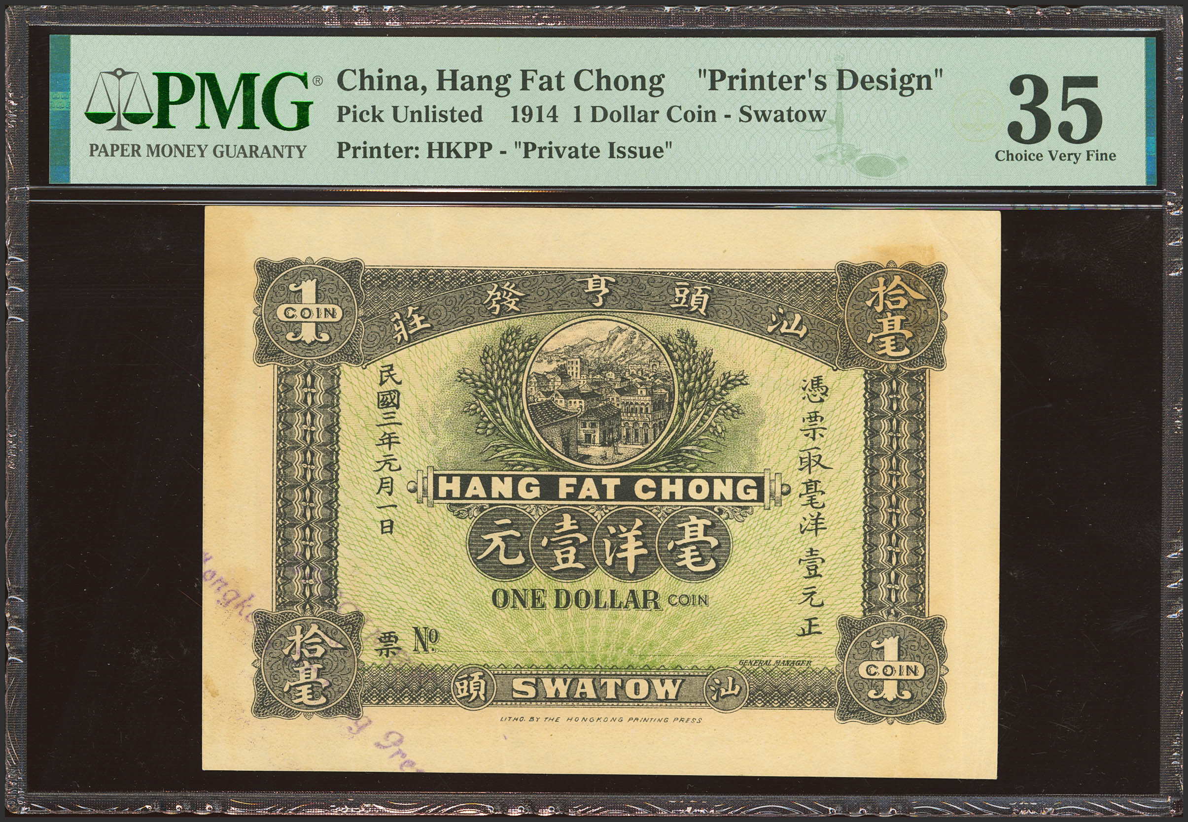 CHINA. 1 Dollar. 1914. Chan Fat Chong. Swatow. Specimen. (Pick: Unlisted). Previously mounted. PMG35 (stain).