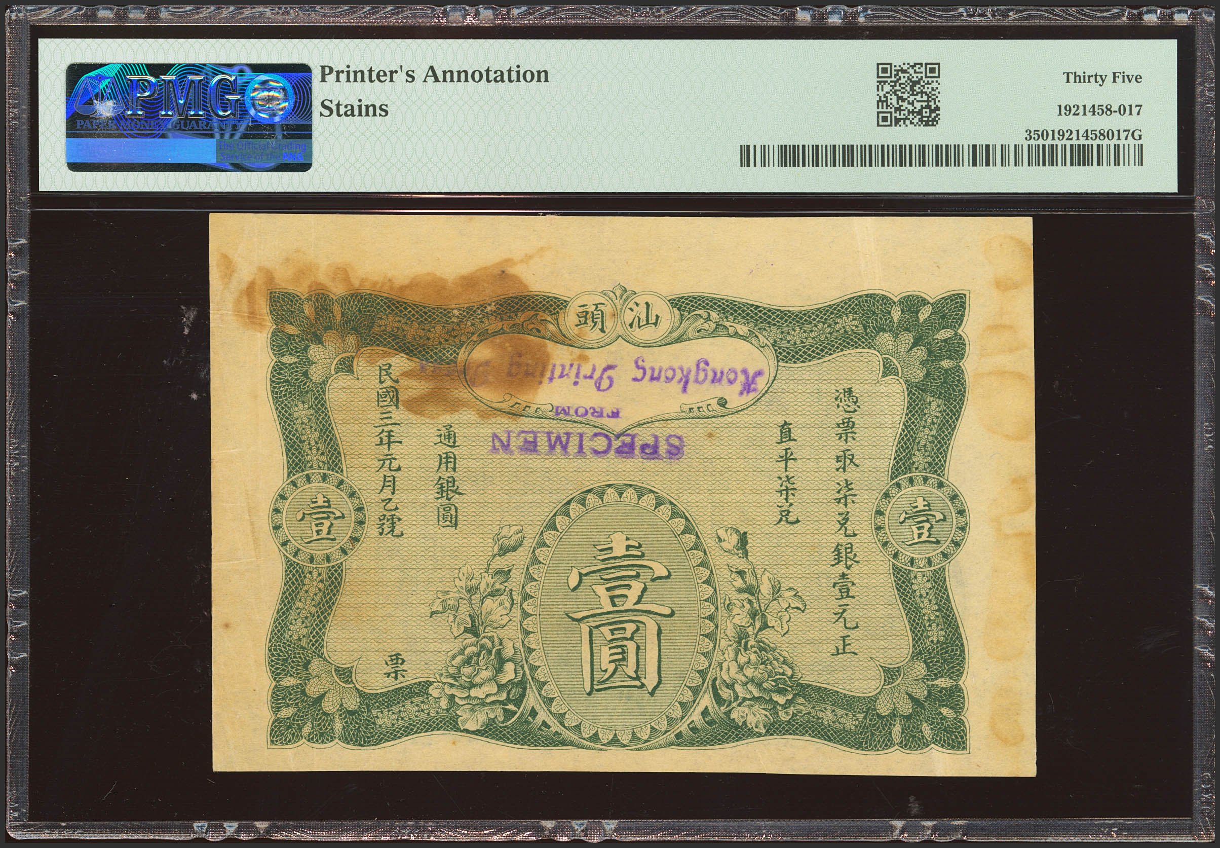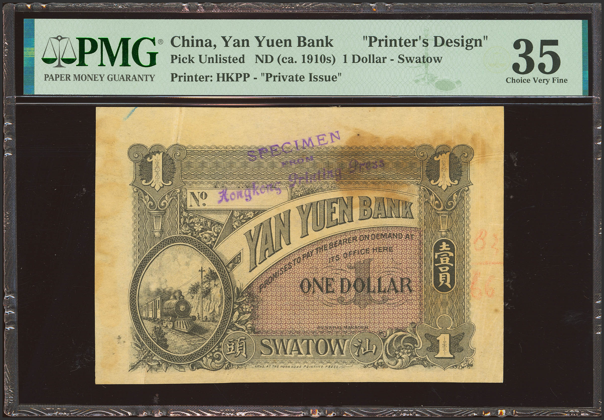 CHINA. 1 Dollar. 1914. Yan Yuen Bank. Swatow. Specimen. (Pick: Unlisted). Previously mounted, annotations. PMG35 (printer's annotation, stains).