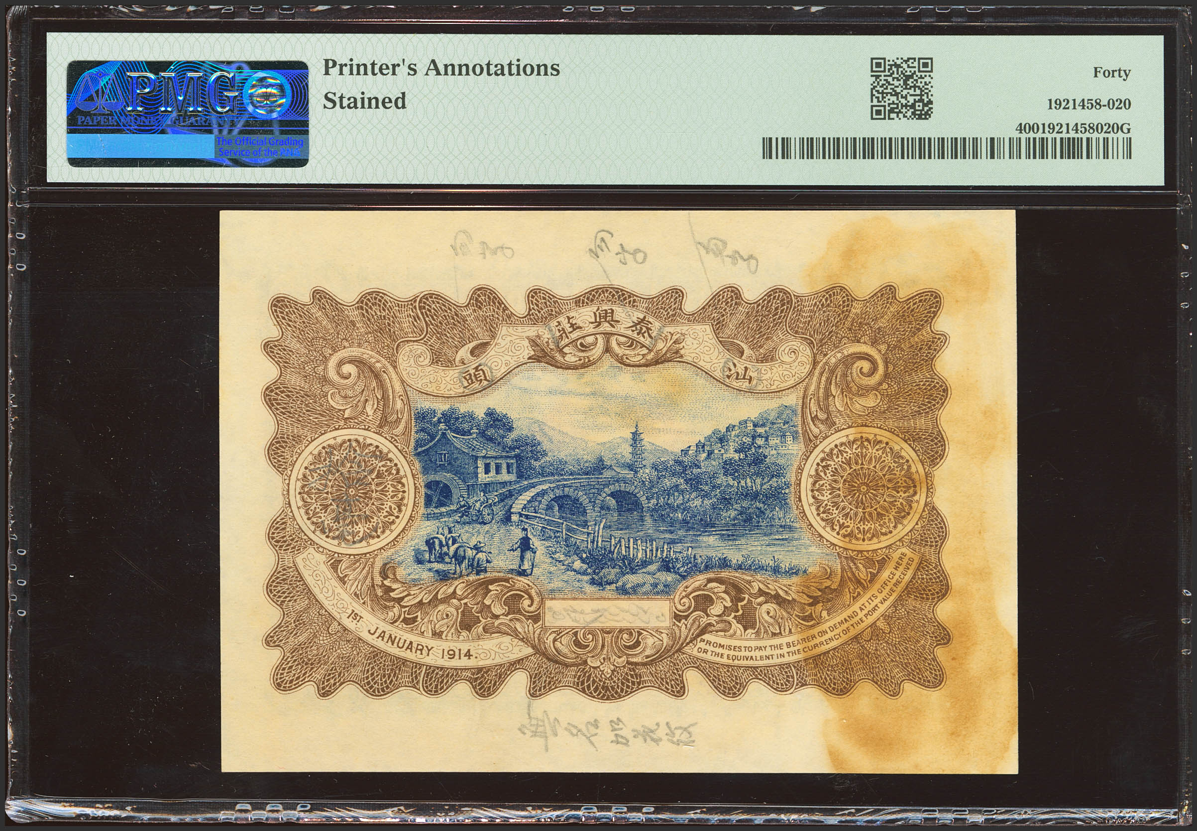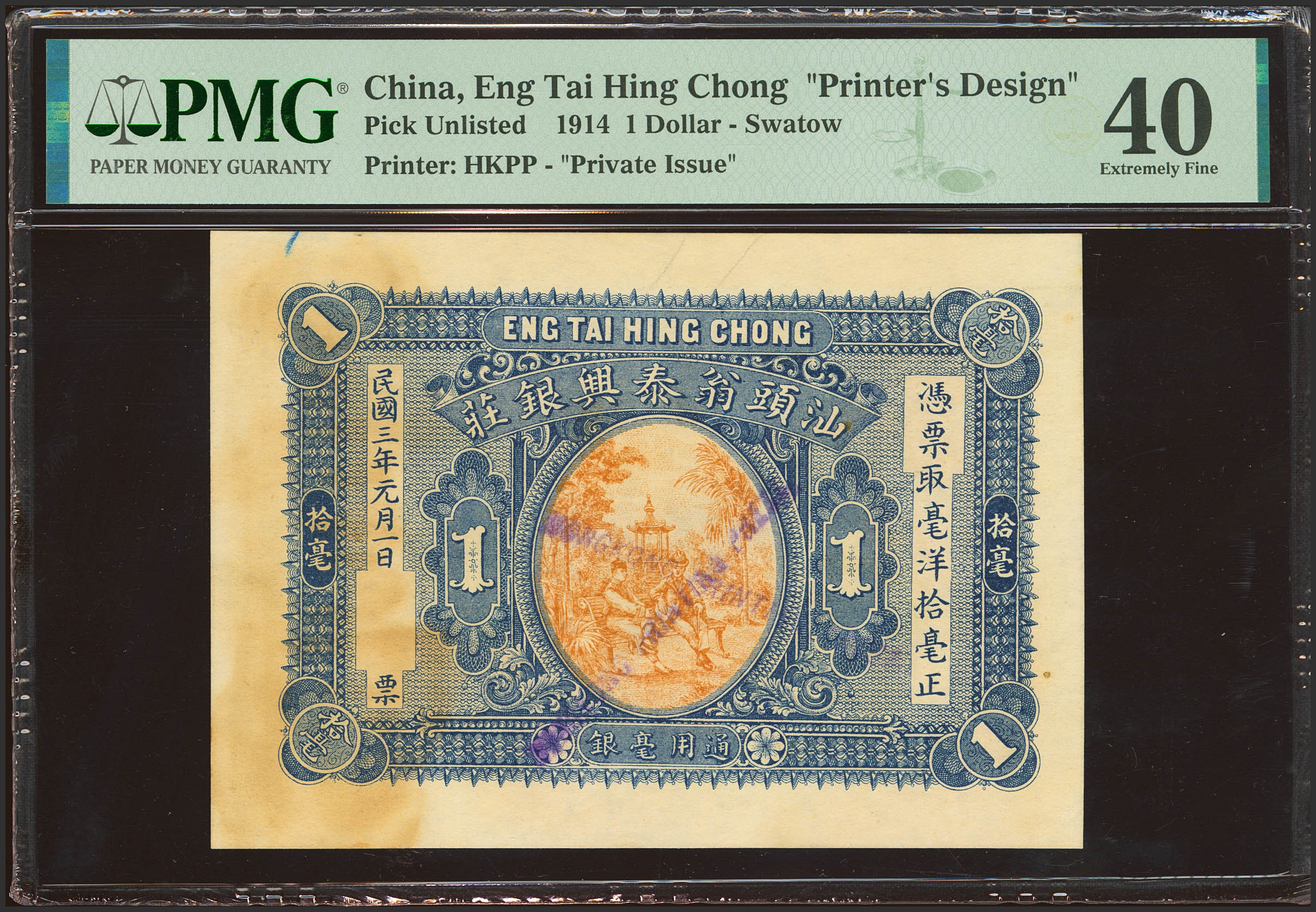 English CHINA. 1 Dollar. 1914. Eng Tai Hing Chong. Swatow. Specimen. (Pick: Unlisted). Previously mounted. PMG40 (printer's annotation, stains).