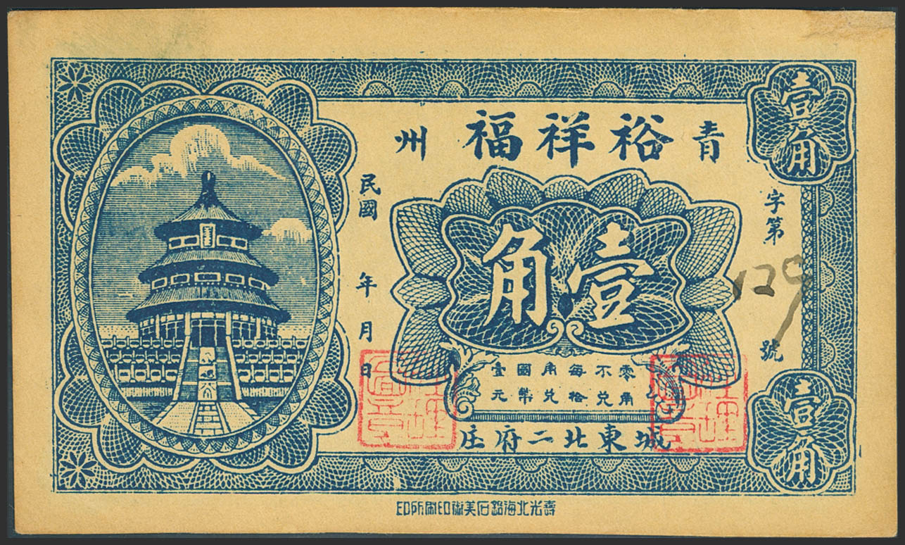 CHINA. 10 Cents. Don't Date. Yu Xiang Fu. Qingzhou. Shandong. Private Issue. (Pick: Unlisted). Right up corner restored. Almost Uncirculated.