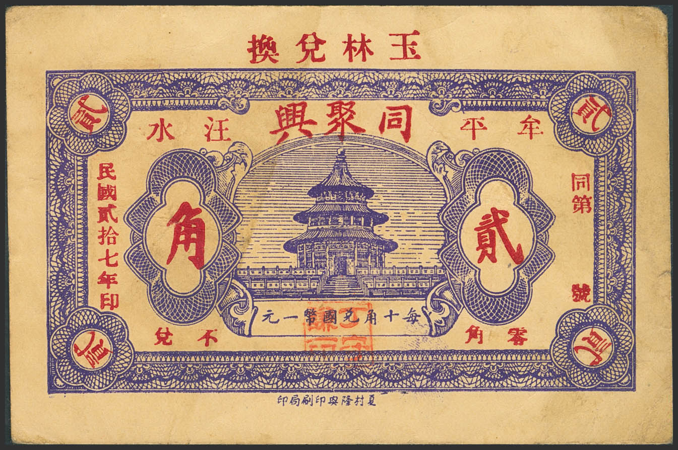 CHINA. 20 Cents. 1938. Yulin Xian. Shaanxi. Private Issue. (Pick: Unlisted). More than Very Fine.