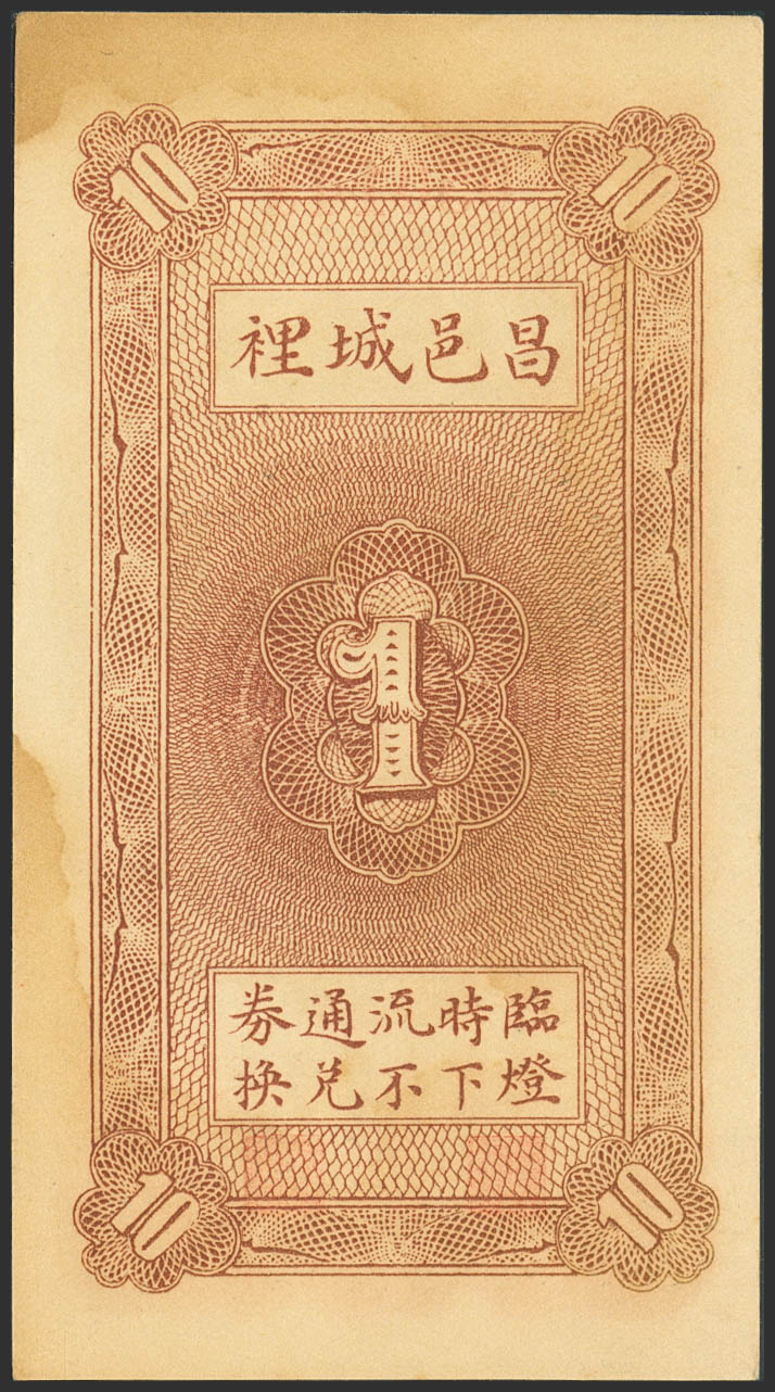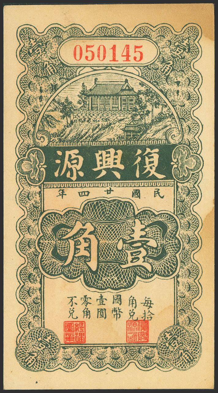 CHINA. 1 Chiao. 1935. Fu Xing. Changyi. Shandong. Private Issue. (Pick: Unlisted). Moisture stains at the top and on the right. Less than Uncirculated.