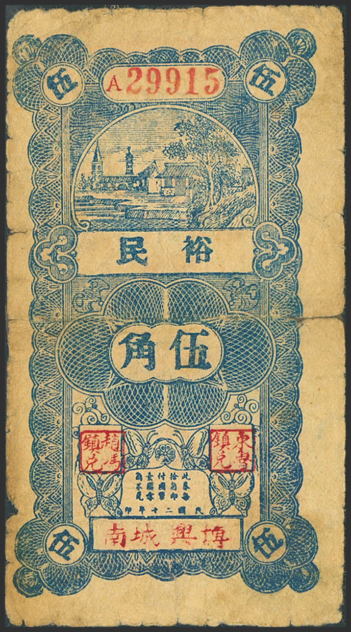 CHINA. 5 Chiao. 1931. Yu Min. Boxing Country. Shandong. Private Issue. (Pick: Unlisted). Tape added at the top and bottom of the central fold, and on the left back. Very Good.