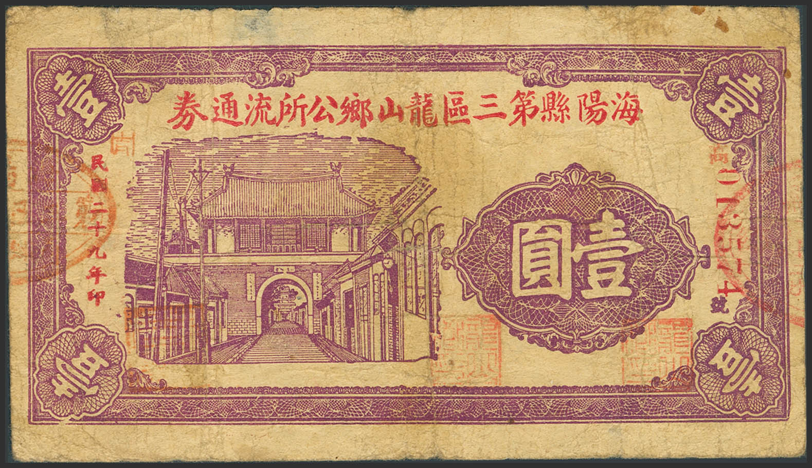 English CHINA. 1 Yuan. 1940. Longshan village. Haiyang. Shandong. (Pick: Unlisted). Fine.