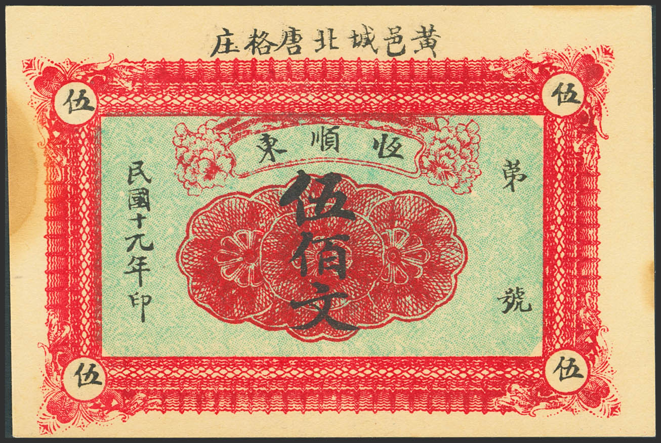 CHINA. 500 Cash. 1920. Heng Shun Dnig. Angi. Shanxi. Private Issue. (Pick: Unlisted). Moisture stain. Less than Uncirculated.
