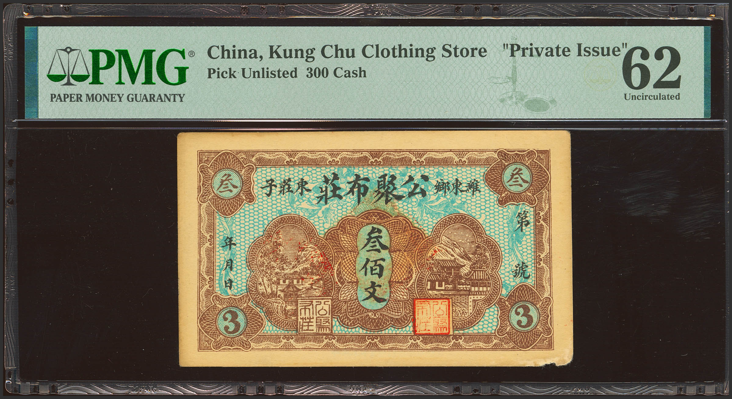 CHINA. 300 Cash. Don't Date. Gong Yu Tailon Shop. Shandong. Private Issue. (Pick: Unlisted). PMG62 (minor corner damage).