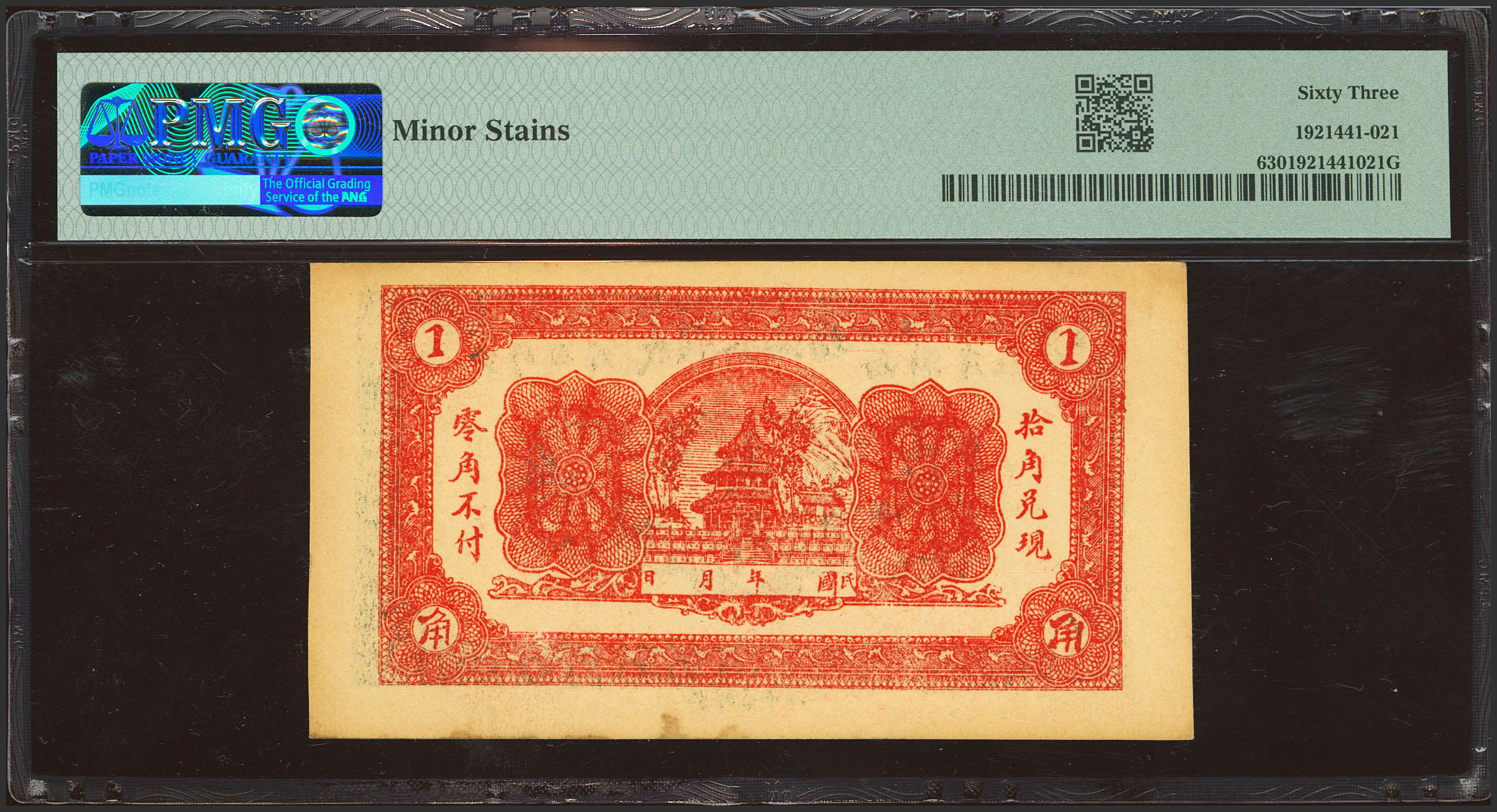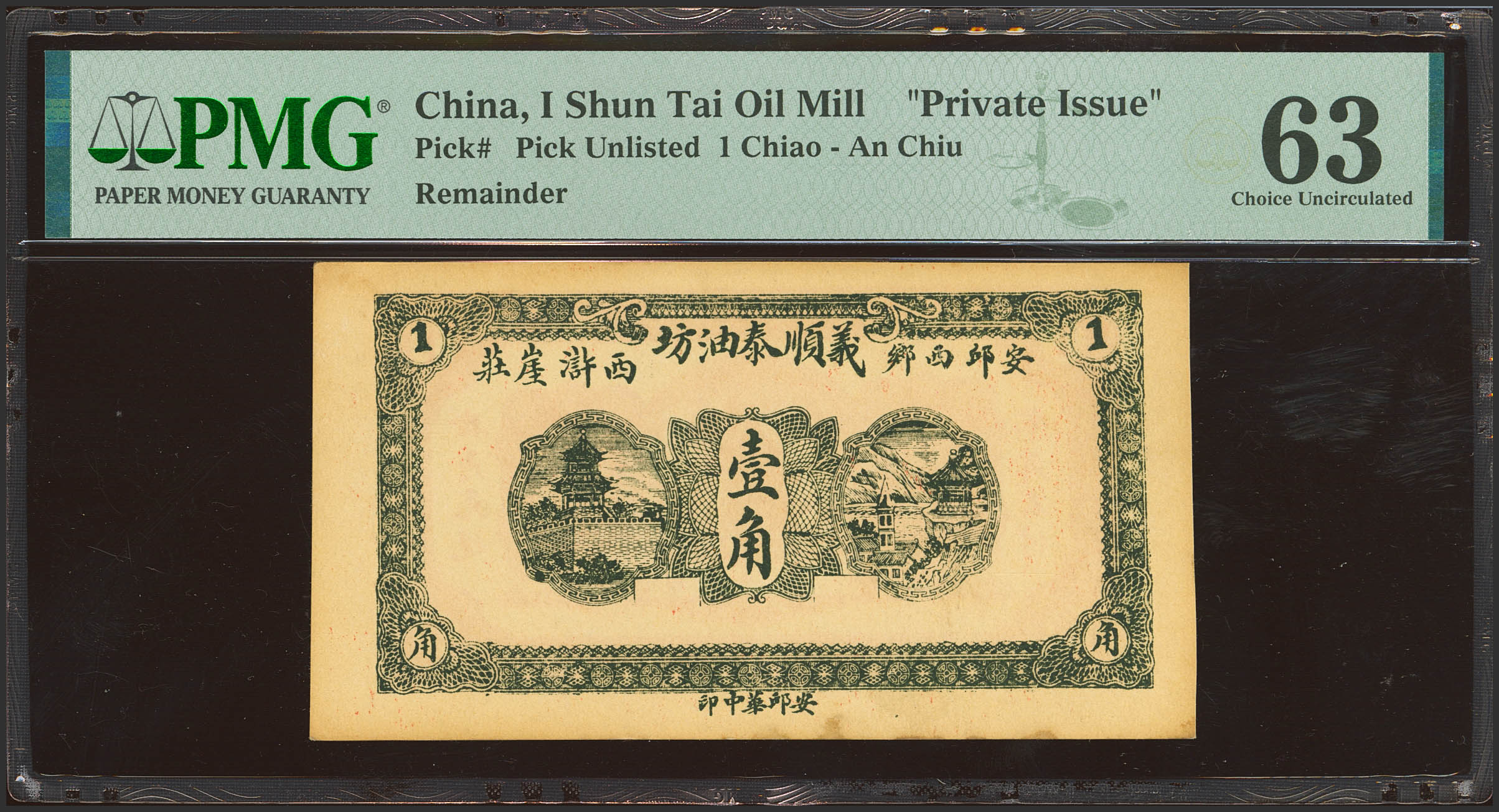 English CHINA. 1 Chiao. Don't Date. Yis Hun Tai. Cooking Oil Refinery. Private Issue. (Pick: Unlisted). PMG63 (minor stains).