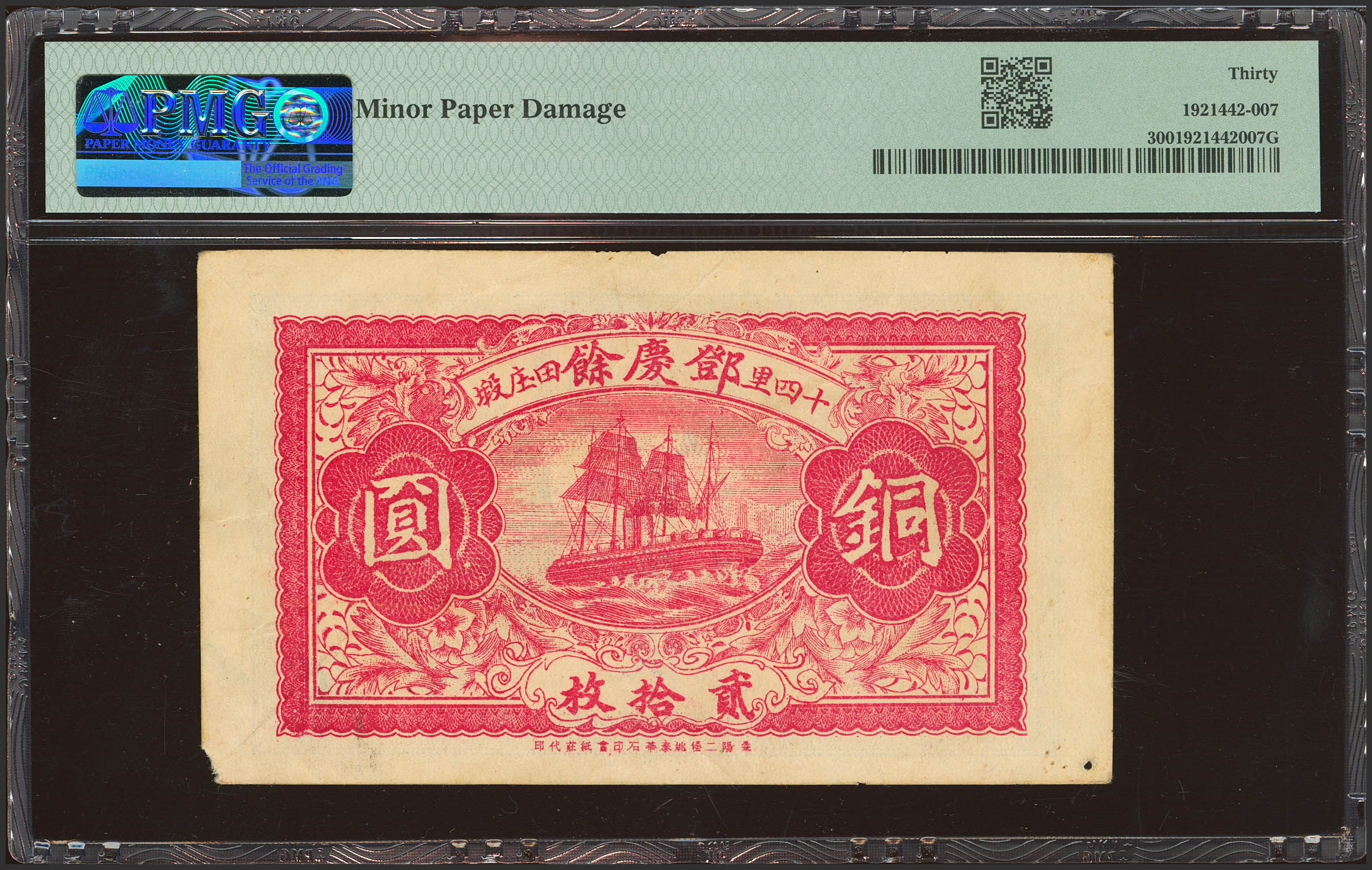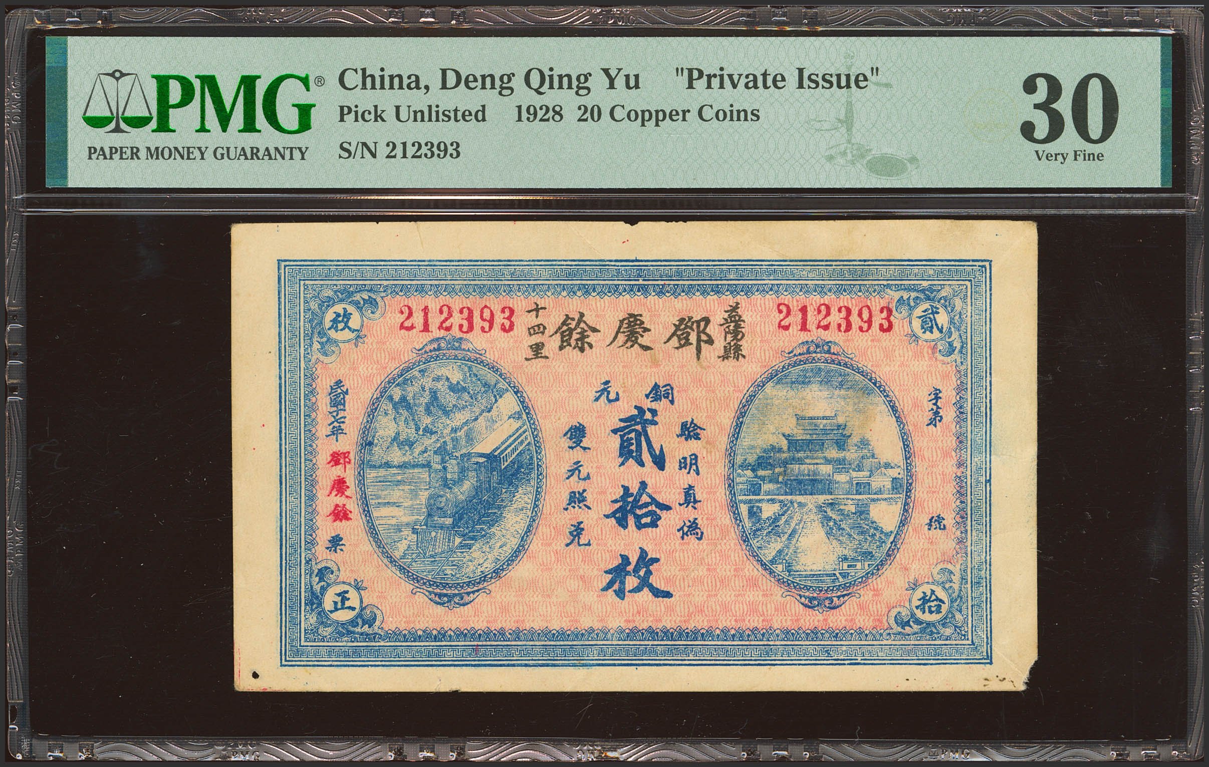 CHINA. 200 Cash. 1928. Deng Qing Yu. Yiyang. Hunan. Private Issue. (Pick: Unlisted). Missing corner, pinhole. PMG30 (minor paper damage).