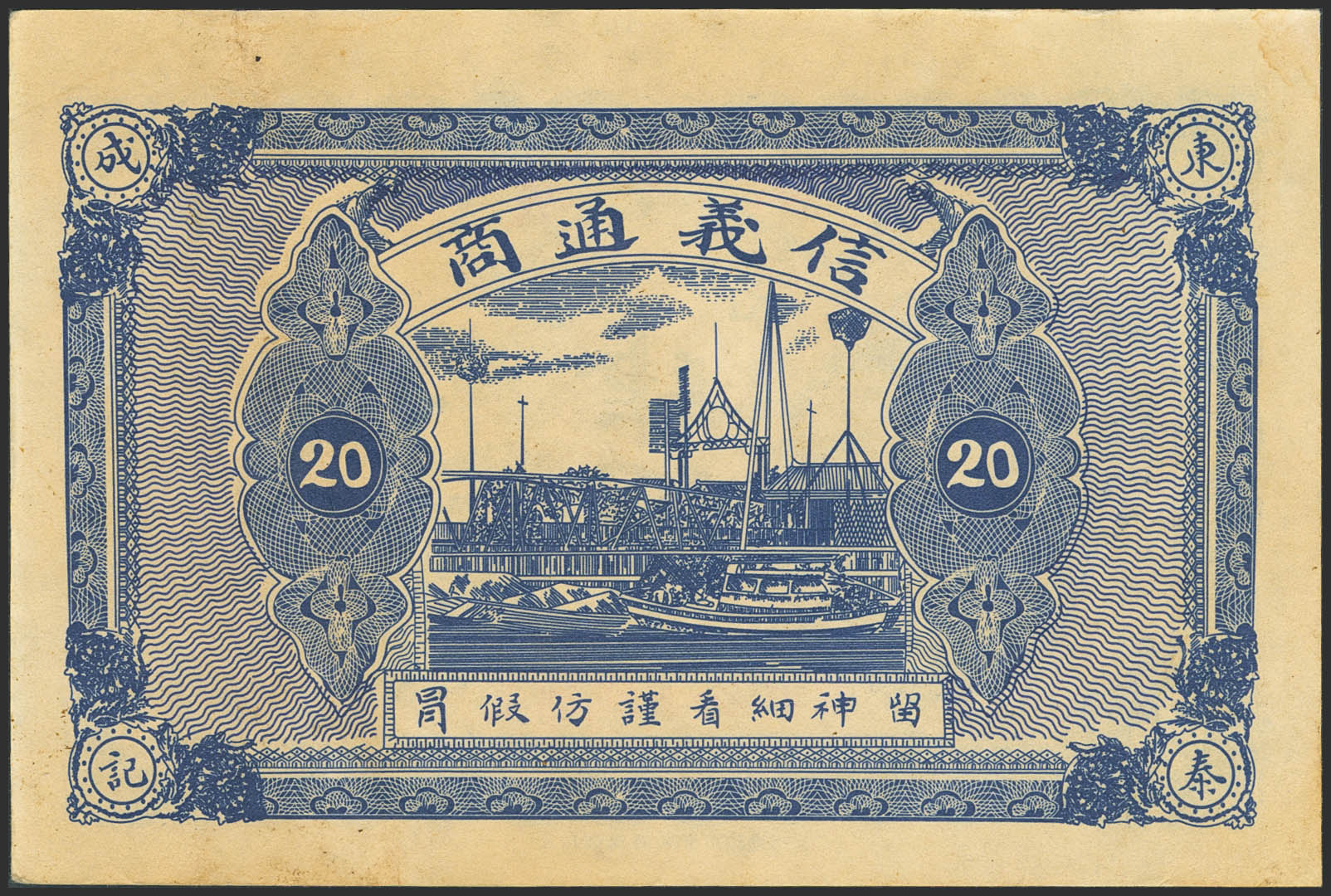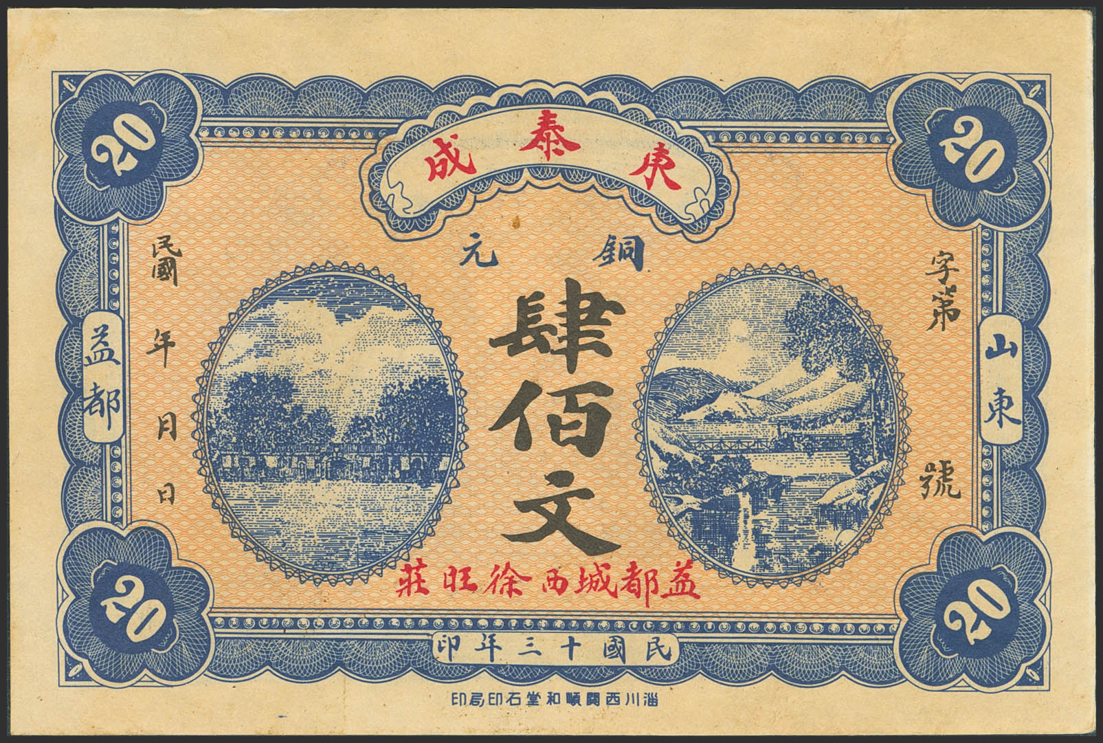 CHINA. 20 Wen. 1924. Counterfeit. Shan Dong. Tai Cheng. Private Issue. (Pick: Unlisted). Almost Uncirculated.