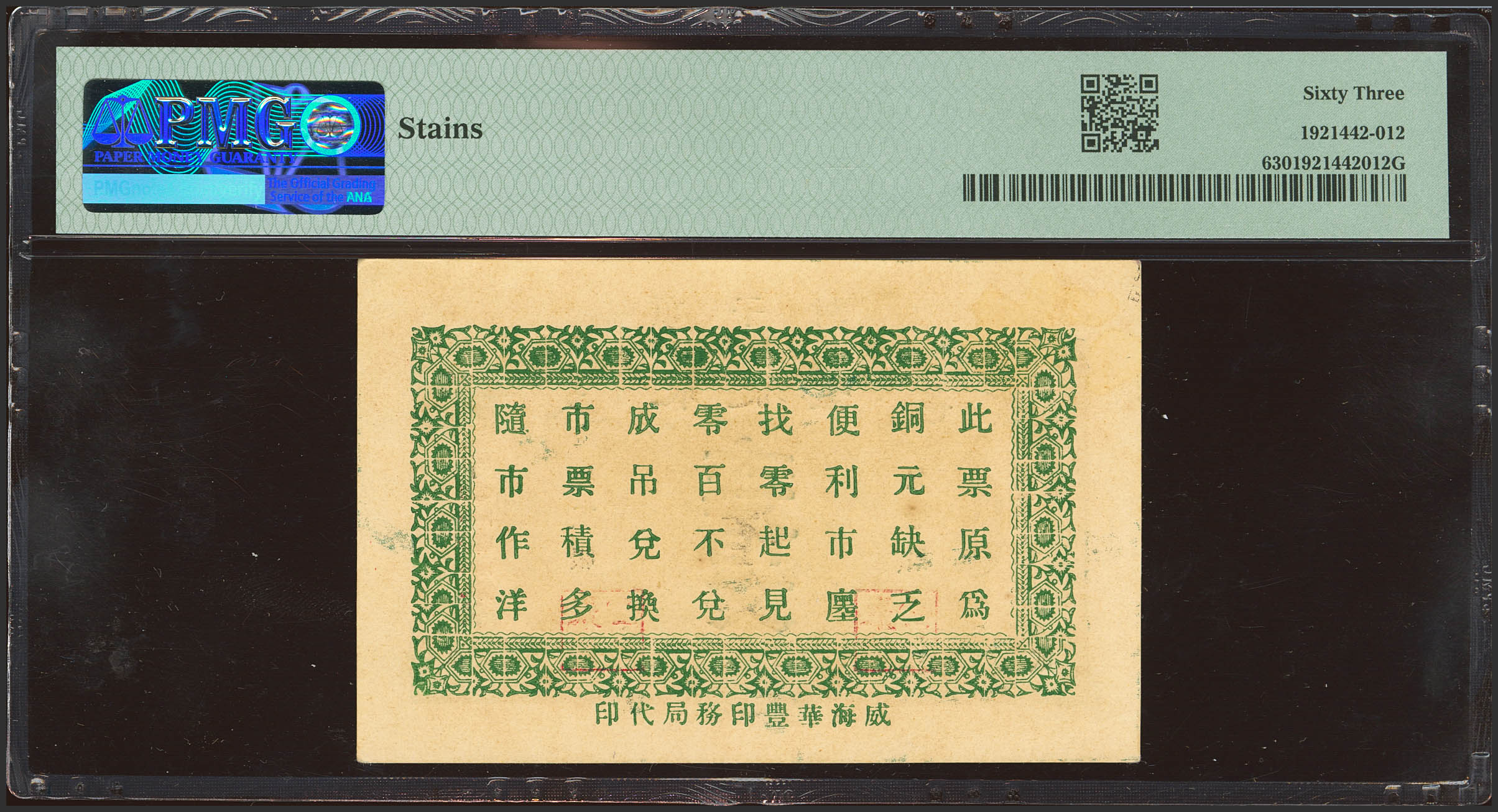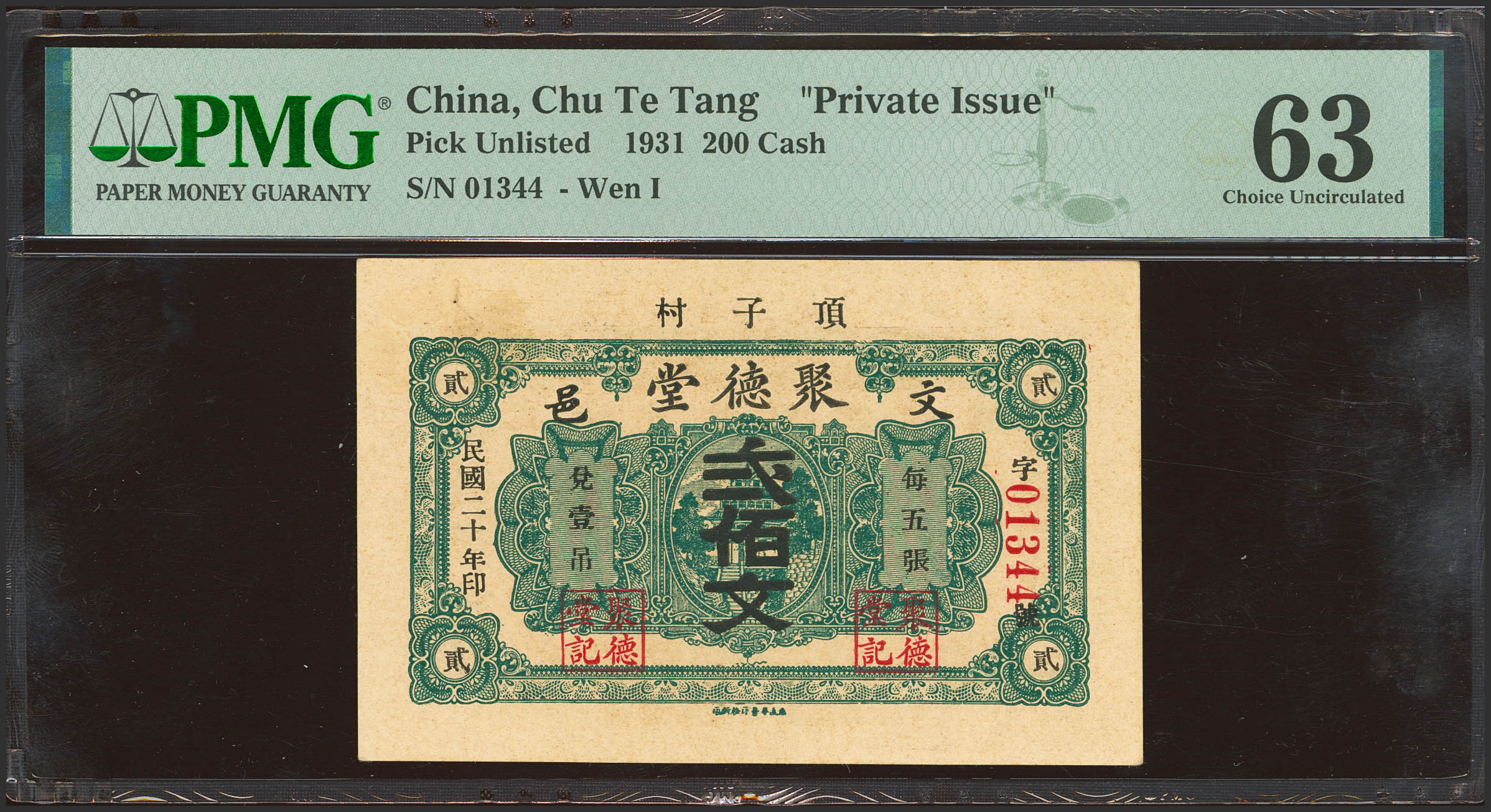CHINA. 200 Cash. 1931. Ju of Tang. Ding Zi. Private Issue. (Pick: Unlisted). Soft stains. PMG63 (stains).