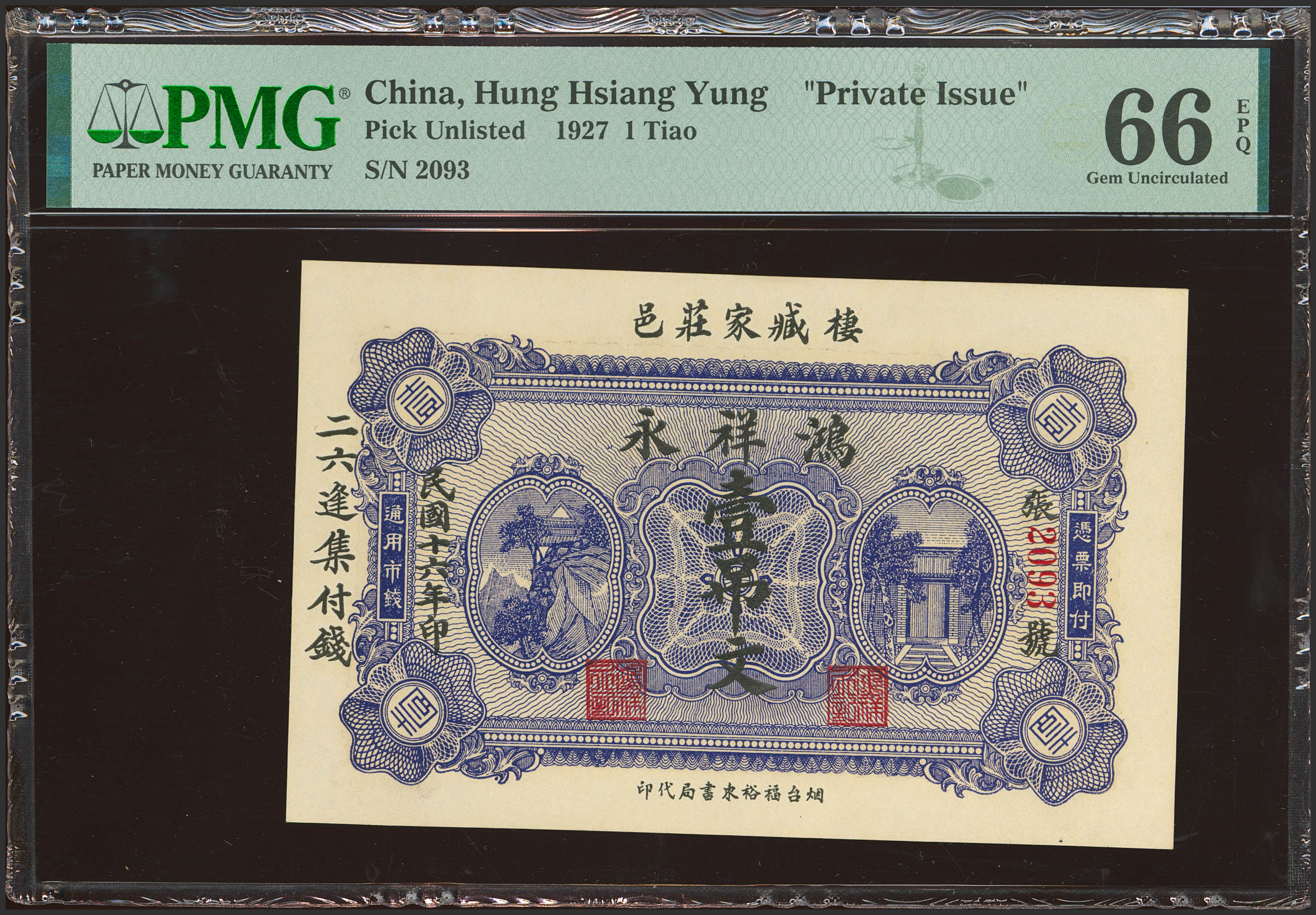 CHINA. 1000 Cash. 1927. Hong Xiang Yong. Yantui. Private Issue. (Pick: Unlisted). PMG66EPQ.