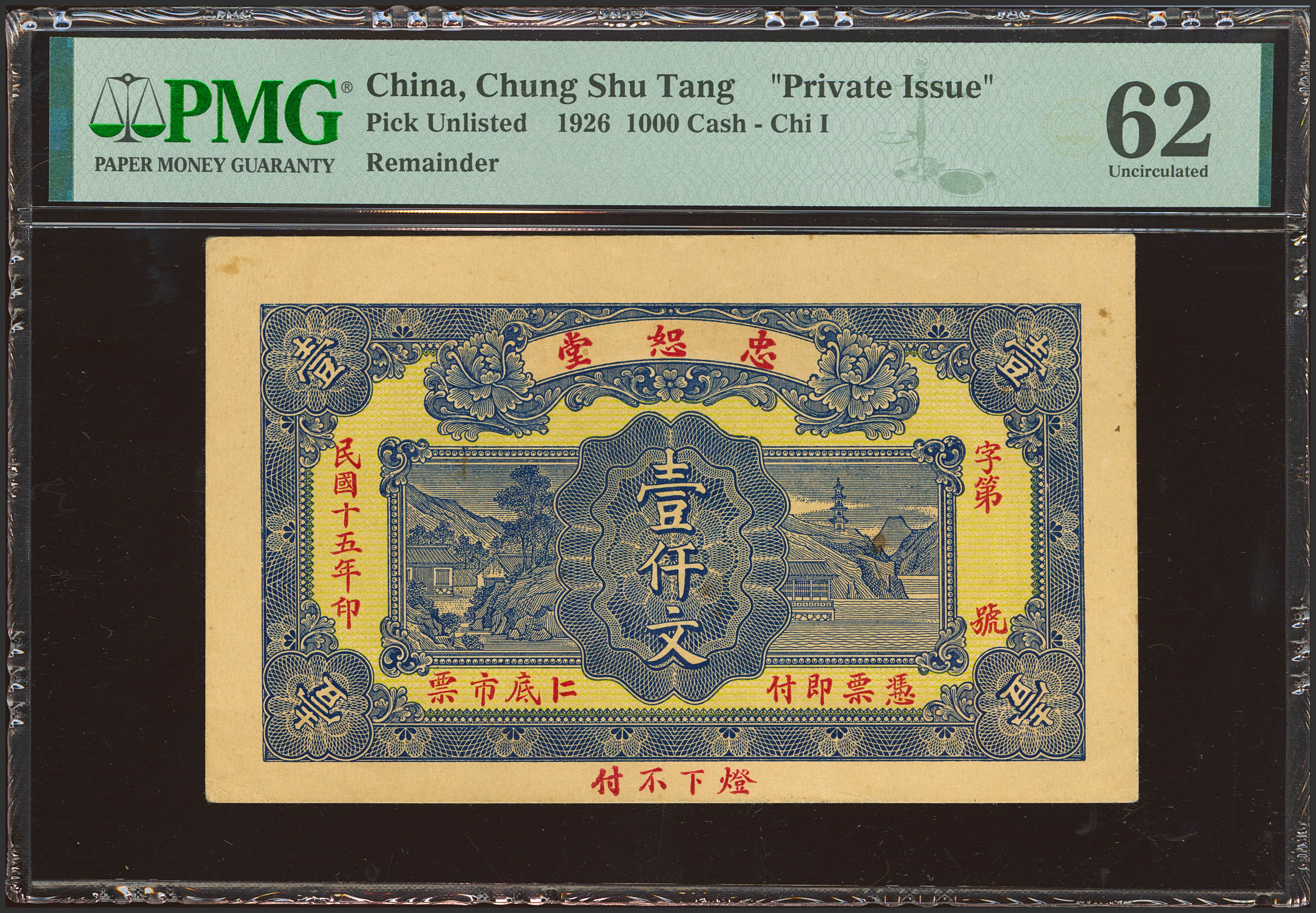 CHINA. 1000 Wen. 1926. Zhong Zhi Tang. Private Issue. (Pick: Unlisted). PMG62.