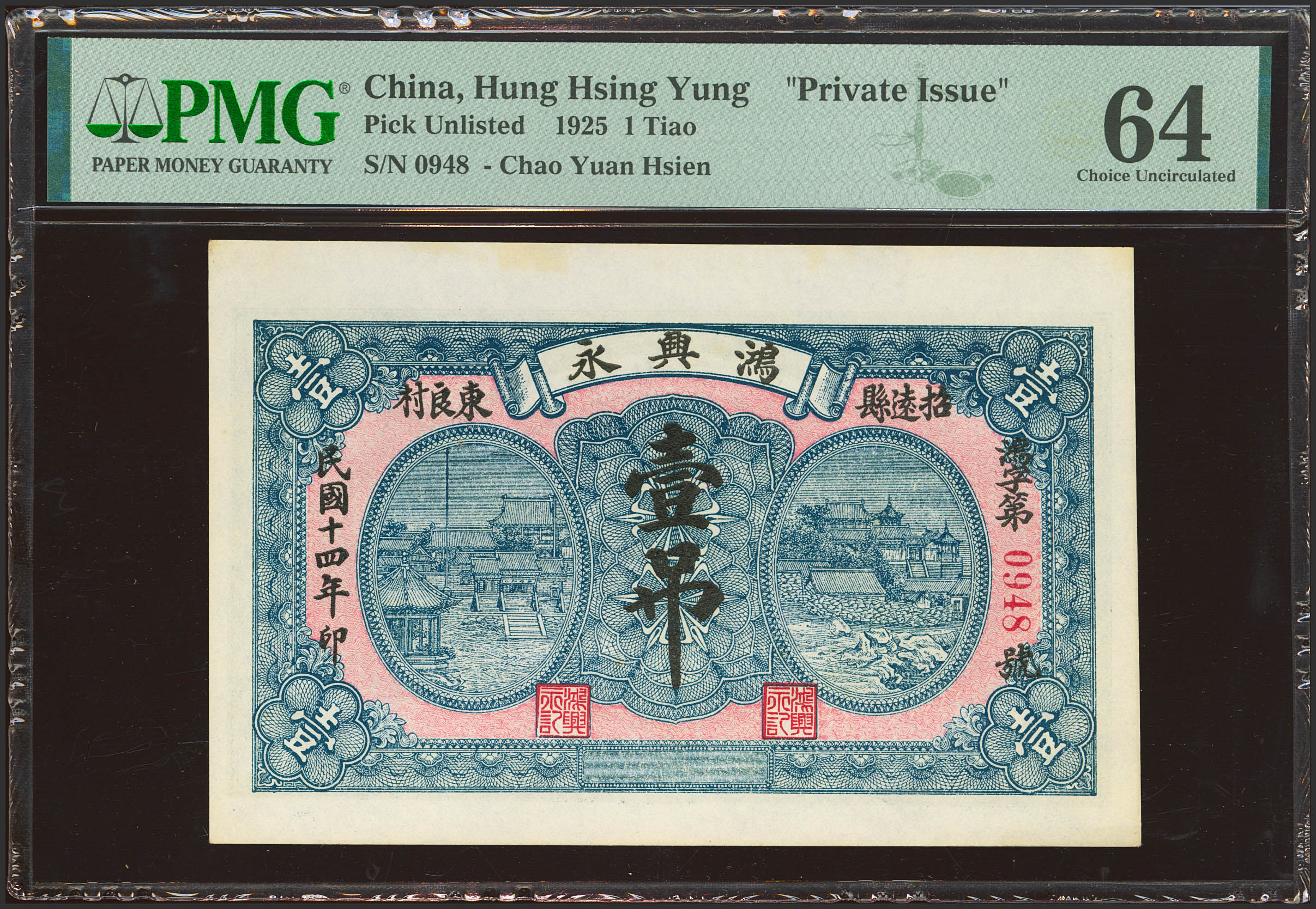 CHINA. 1000 Cash. 1925. Hong Xing Yong. Zhaoyuan. Private Issue. (Pick: Unlisted). PMG64.