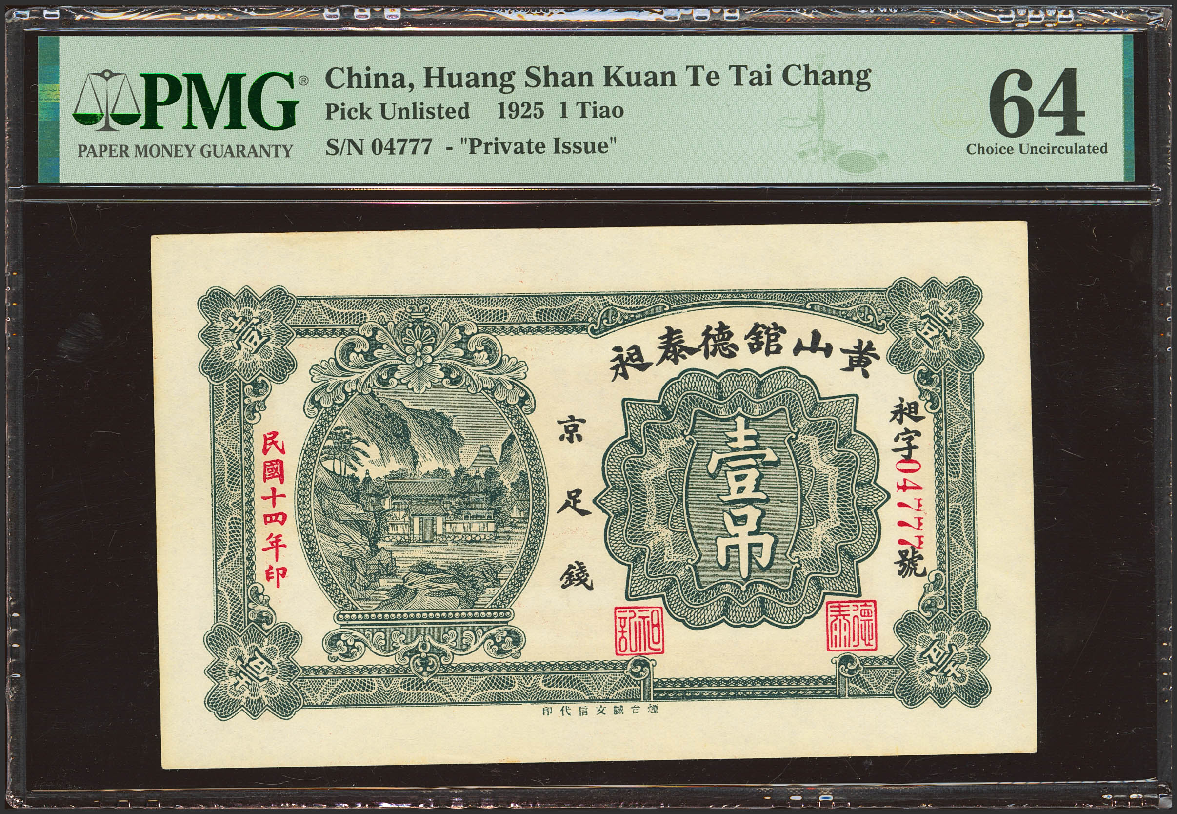 CHINA. 1 Tiao. (1925ca). Hsien Kuan. Te Tai Chang. Private Issue. (Pick: Unlisted). PMG64.