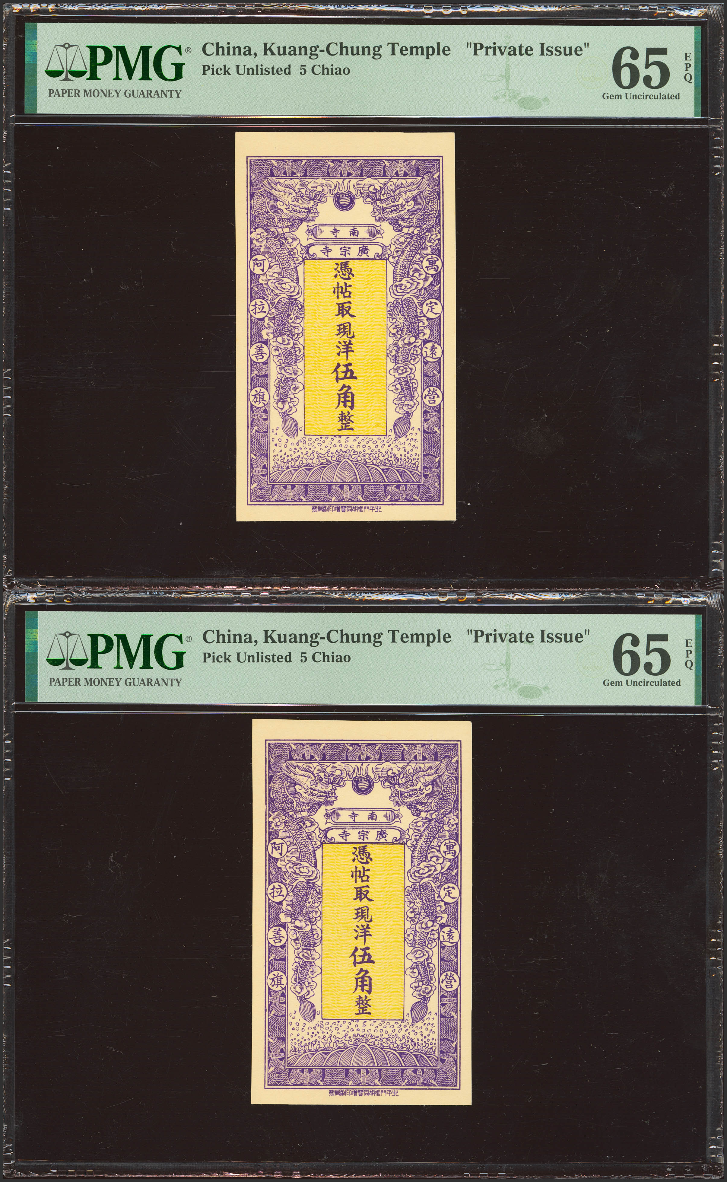 CHINA. Lot of 2 notes of 50 Cents. Don't Date. TempleMoney. GZS (Pick: Unlisted). PMG65EPQ, both.