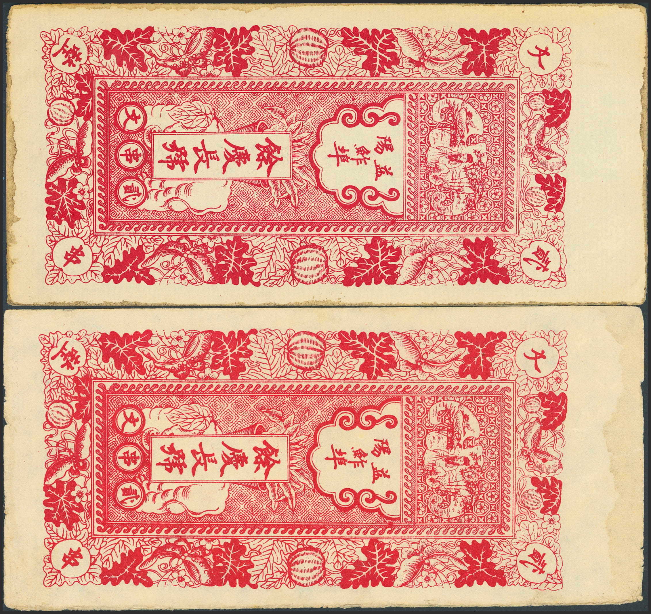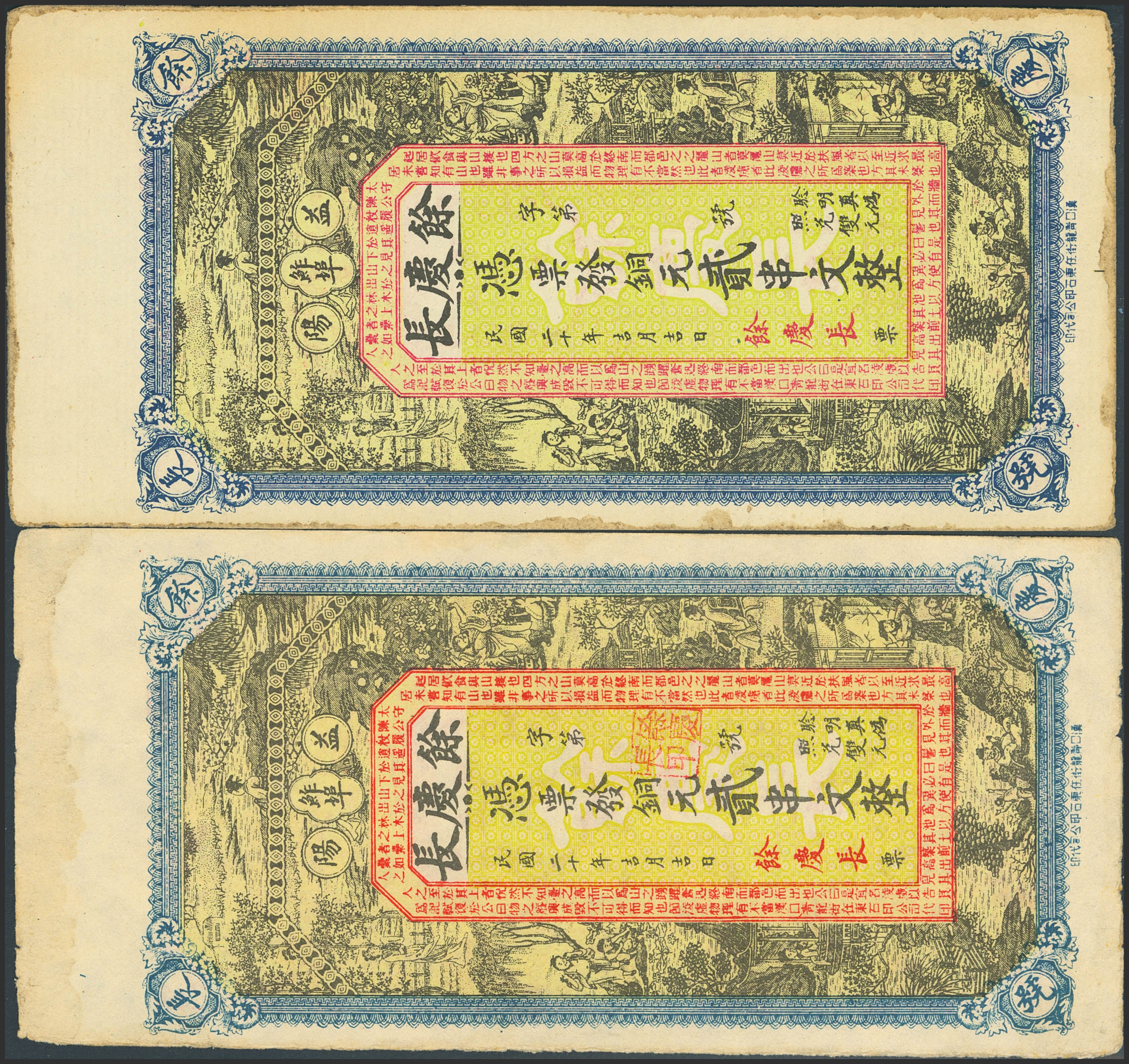 English CHINA. Lot of 2 notes of 2000 Cash. Don't Date. Counterfeit. Yi Ching Chan Bank. Private Issue. (Pick: Unlisted). Almost Uncirculated.