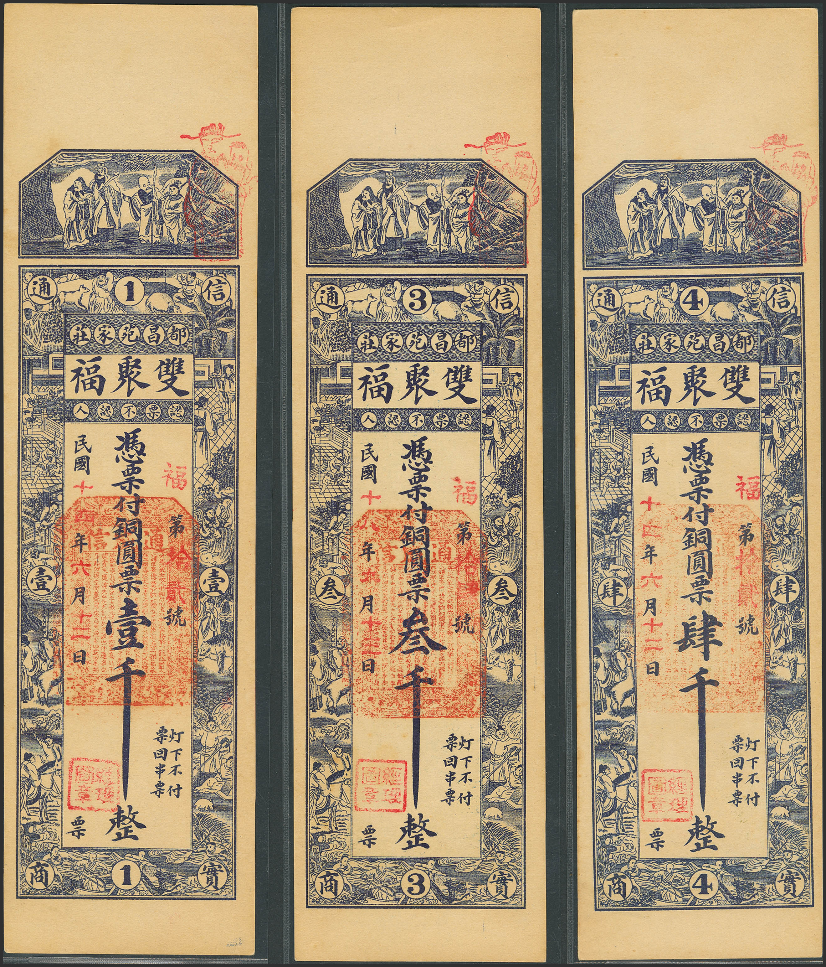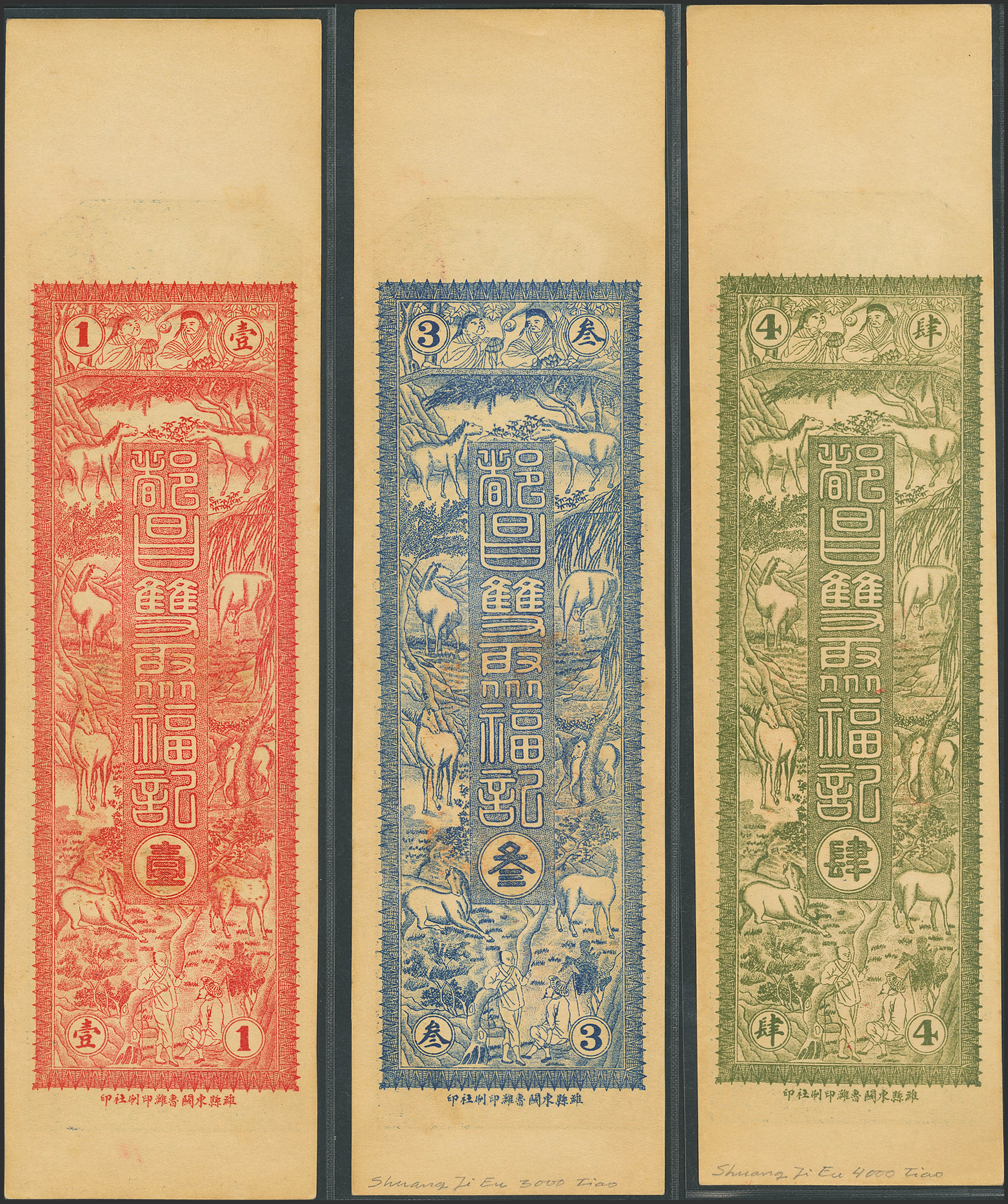 CHINA. Lot of 3 notes of 1000, 3000 and 4000 Tiao. Don't Date. Shuang Ji Fu. Private Issue. (Pick: Unlisted). Less than Uncirculated.