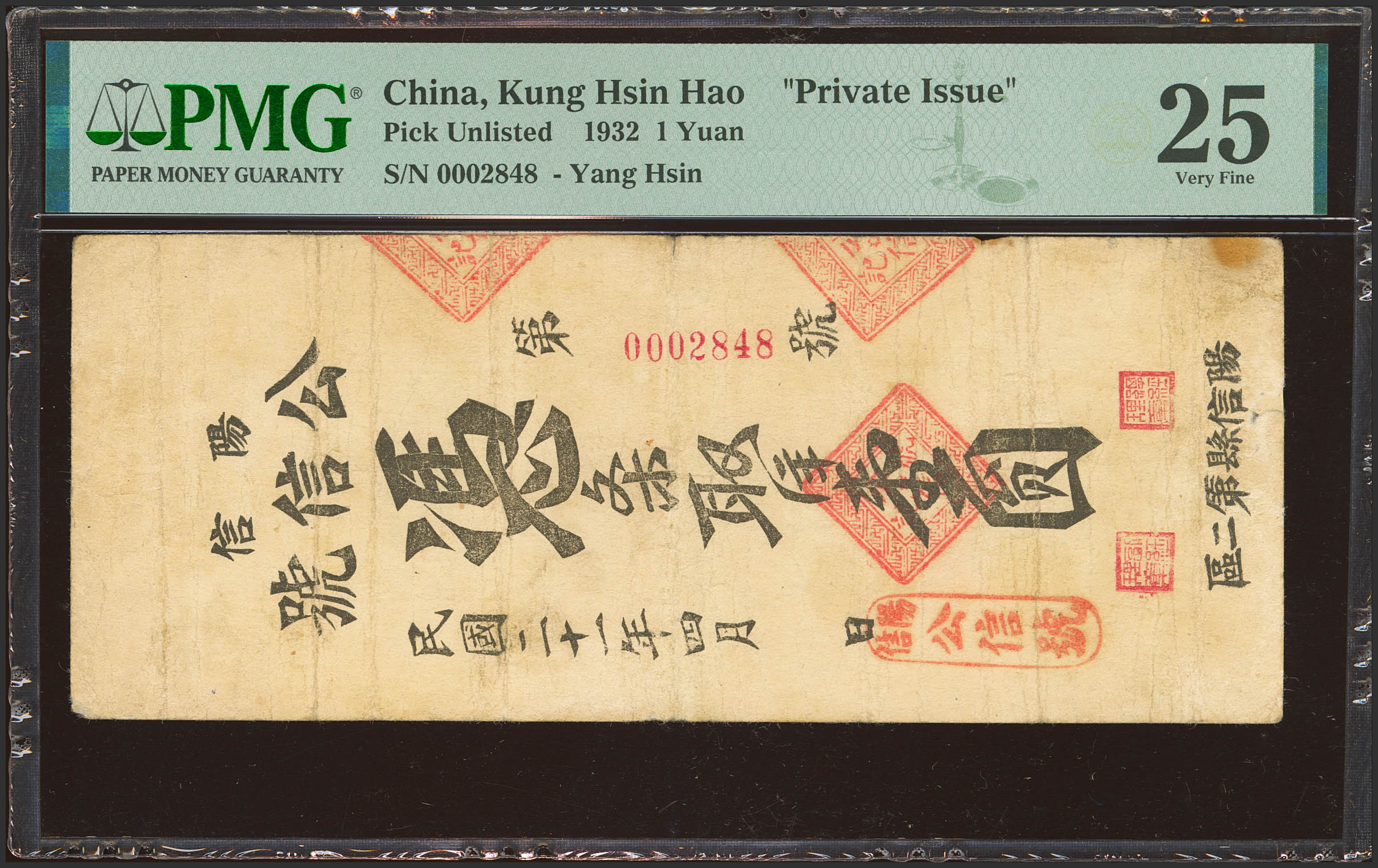 CHINA. 1 Yuan. April 1932. Gong Xin Hao. Yang Xin. Private Issue. (Pick: Unlisted). PMG25 (piece added, rust).