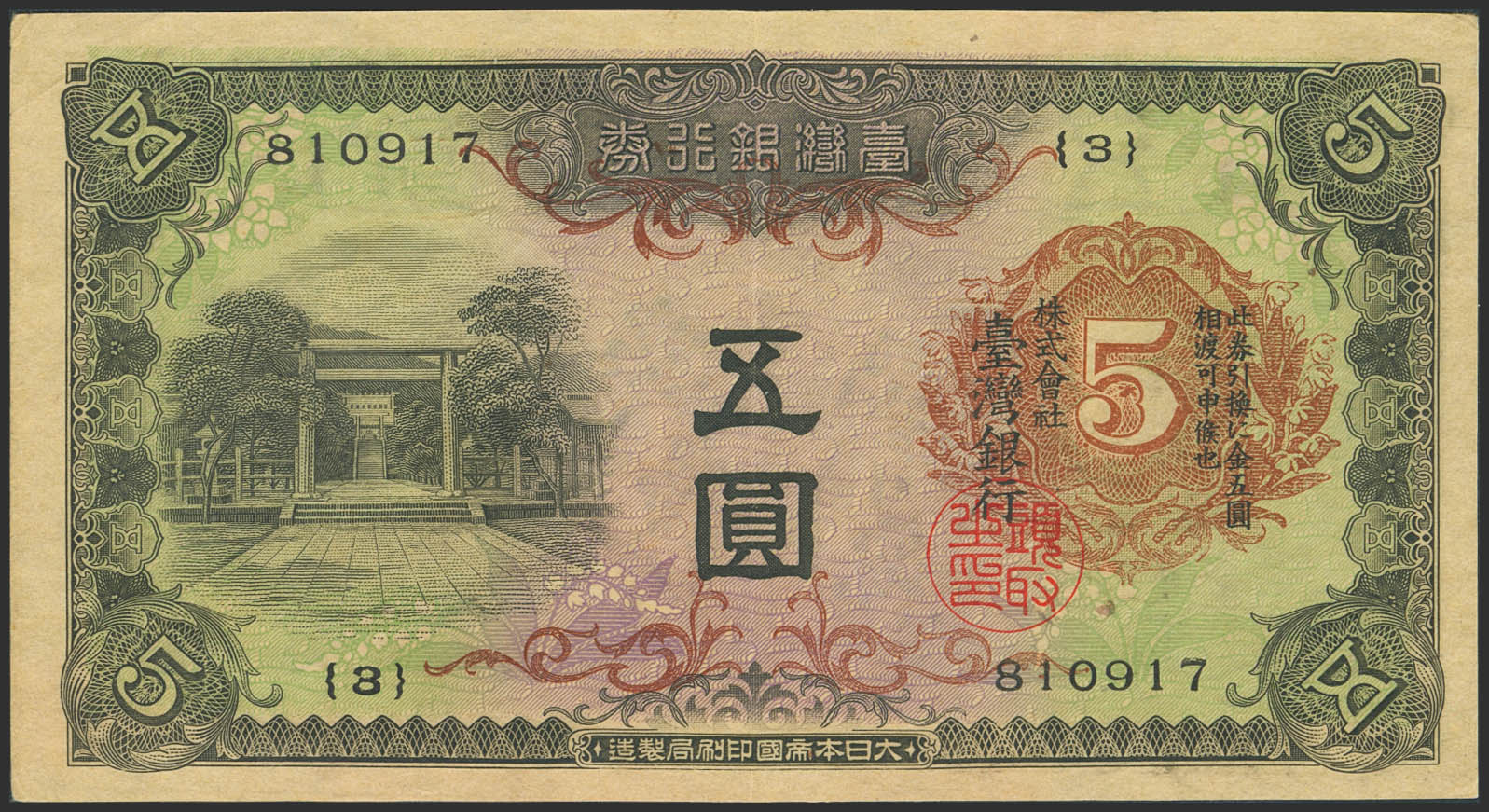 TAIWAN. 5 Yen. (1944ca). Bank of Taiwan. (Pick: 1929a). Extremely Fine.