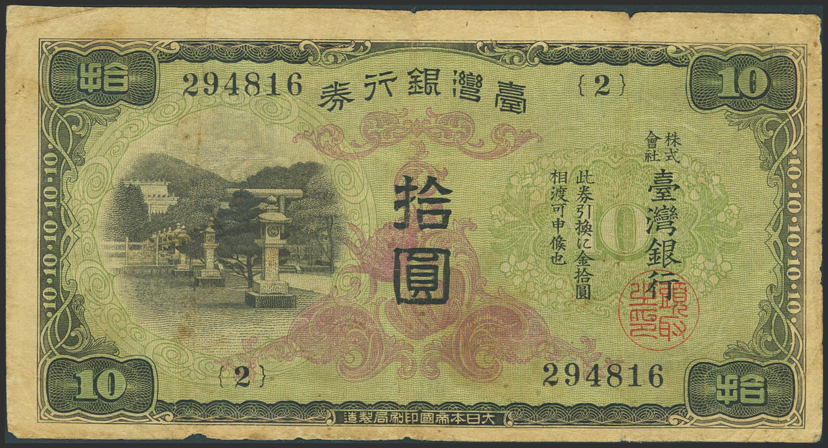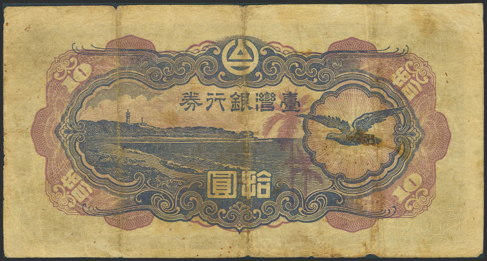 TAIWAN. 10 Yen. (1944ca). Bank of Taiwan. (Pick: 1930a). Solid residue on back. Very Fine.