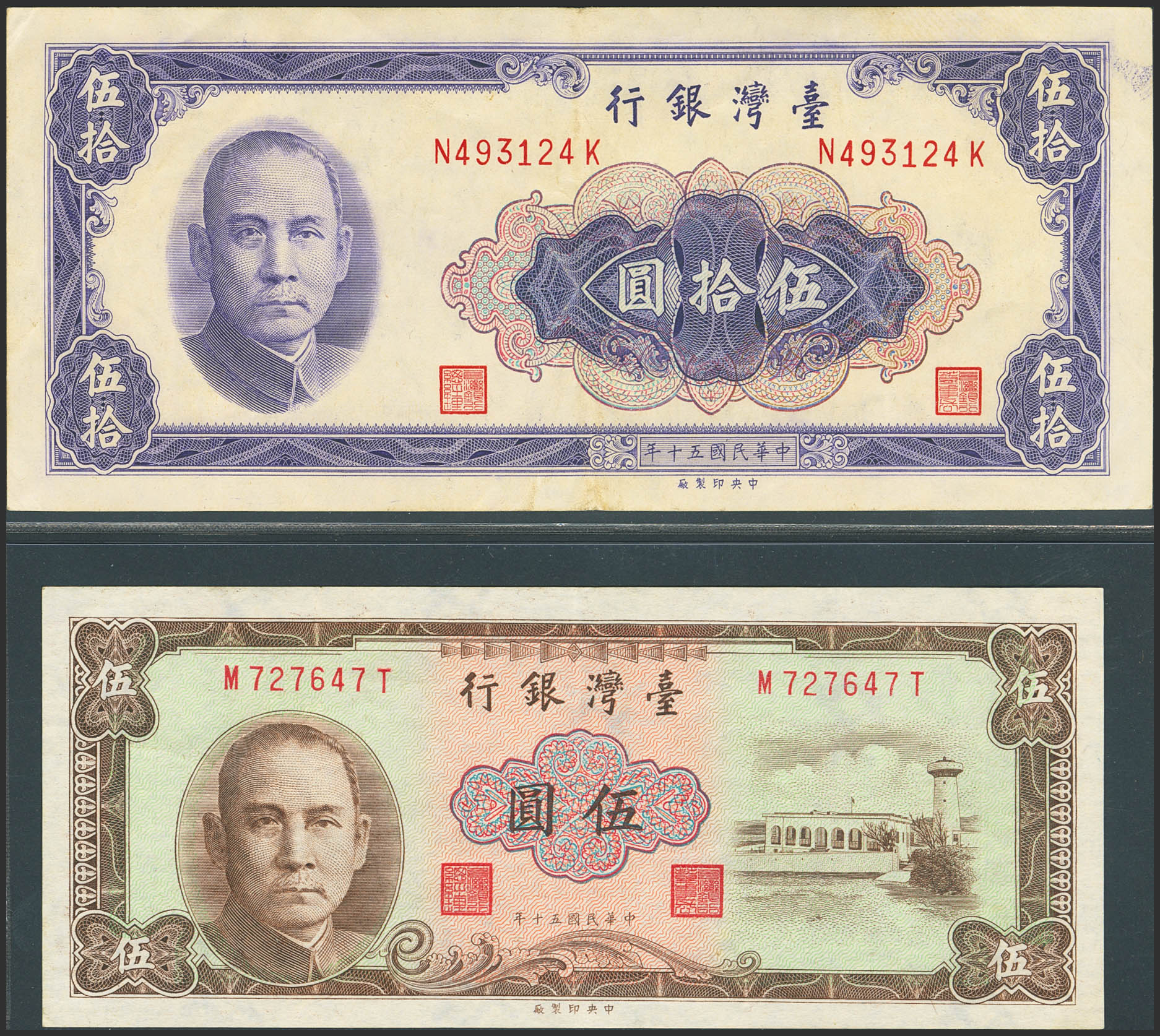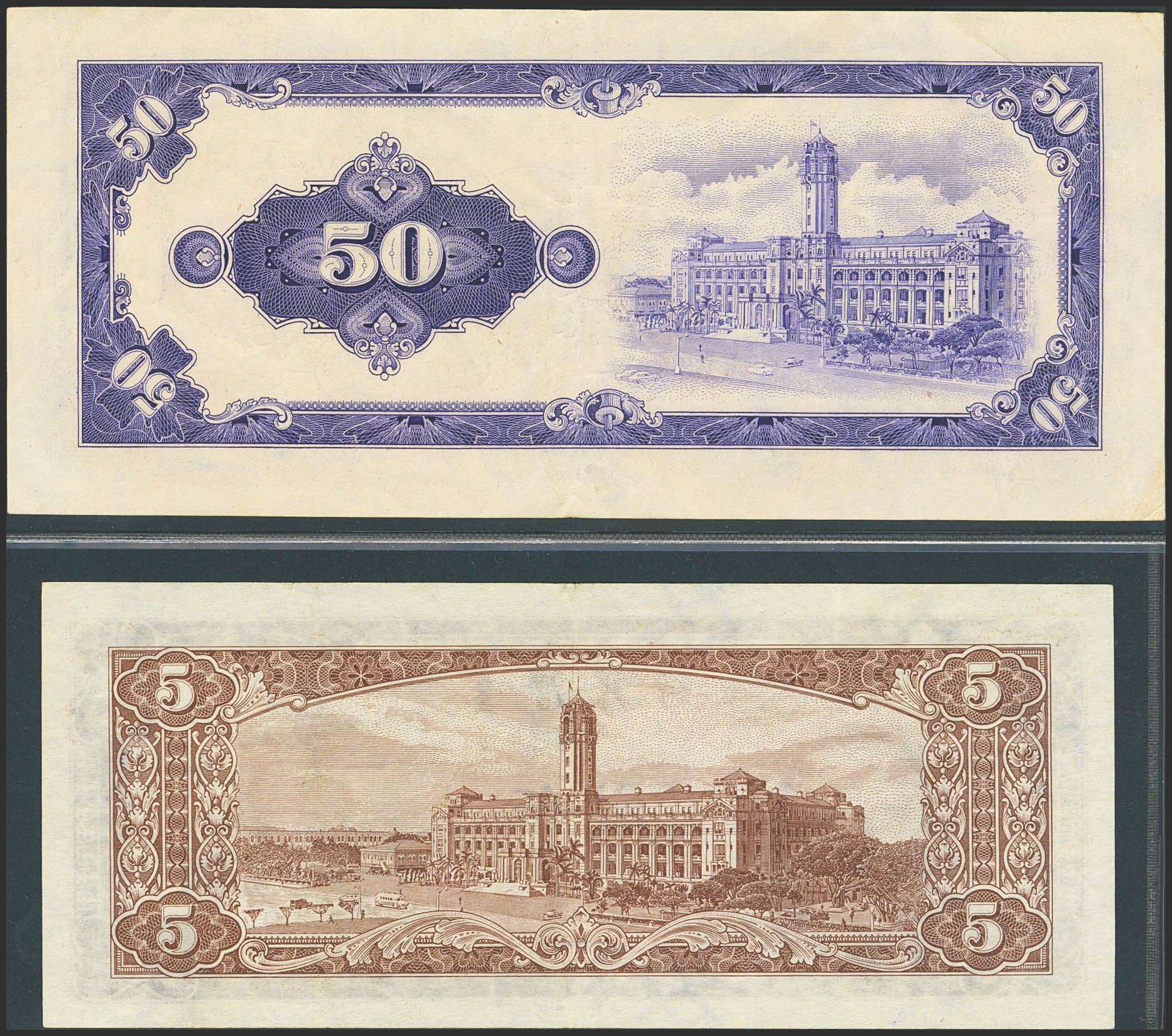 English TAIWAN. Lot of 2 notes of 5 and 50 Yuan. 1961. Bank of Taiwan. (Pick: 1973 and 1974). Extremely Fine.