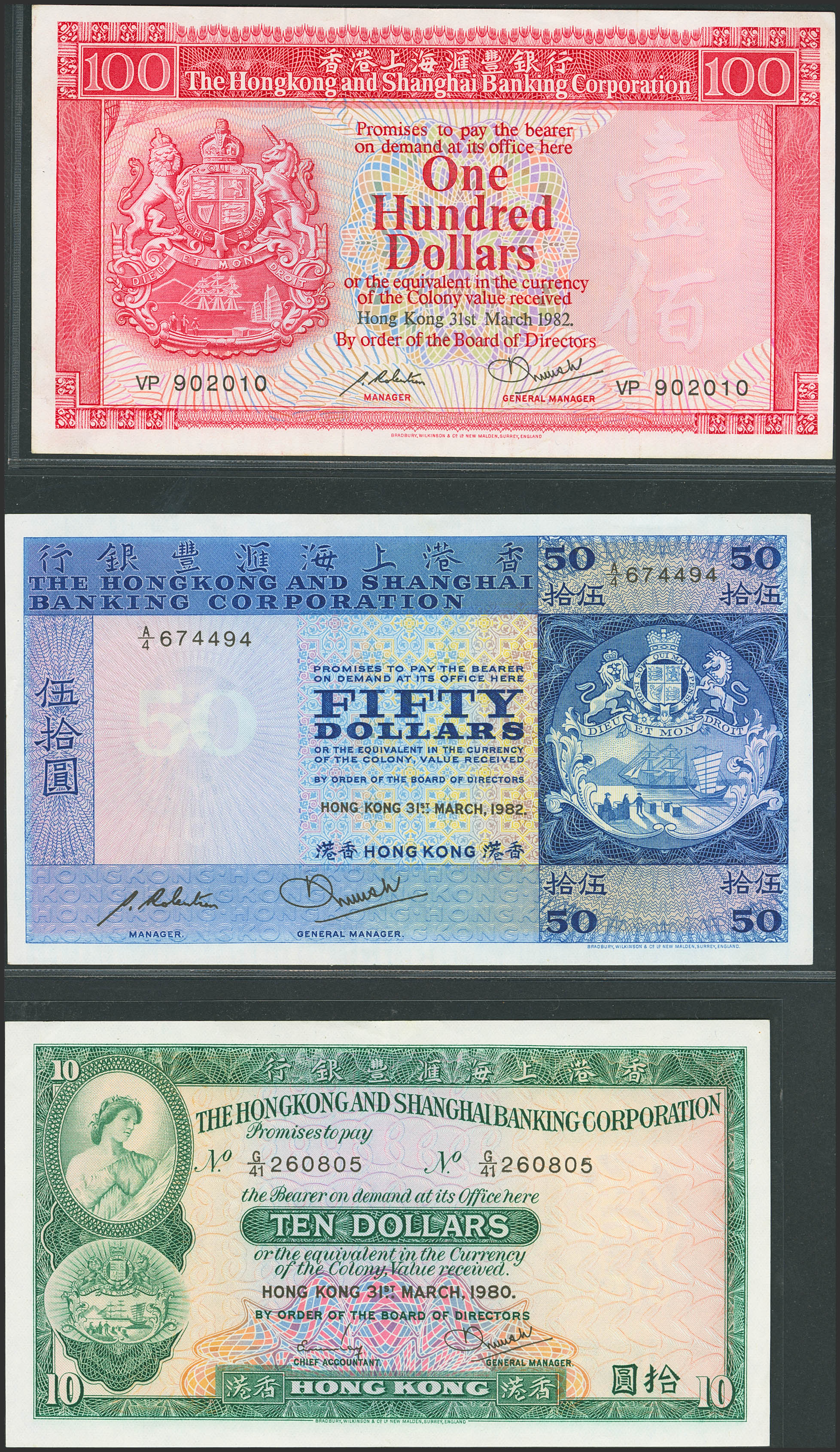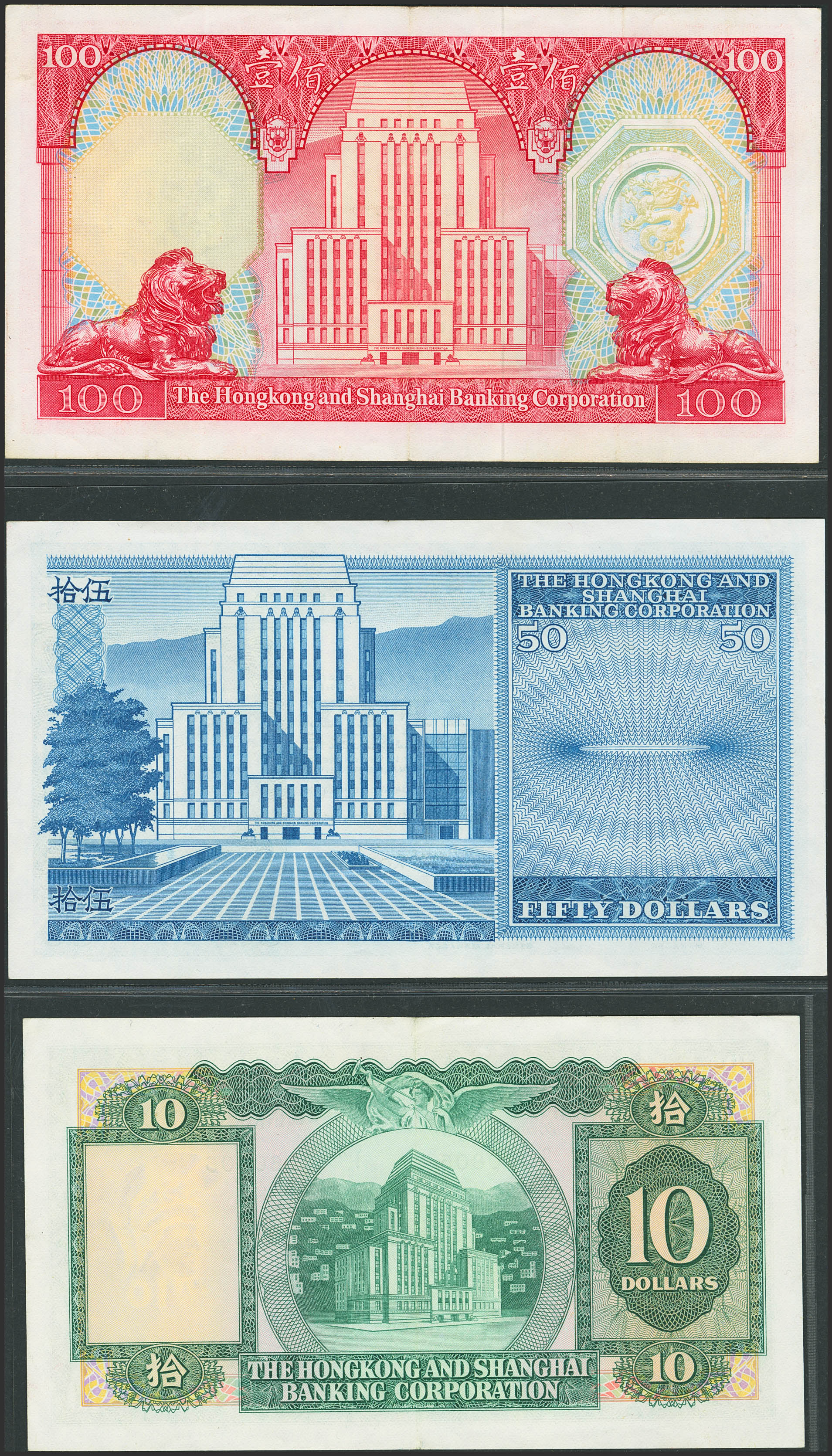 HONG KONG. Lot of 3 notes of 10, 50 and 100 Dollars. 31 March 1980 and 31 March 1982. Hongkong and Shanghai Banking Corporation. (Pick: 182i, 184H, 187d). Almost Uncirculated ($10 and $50) and More than Very Fine ($100).
