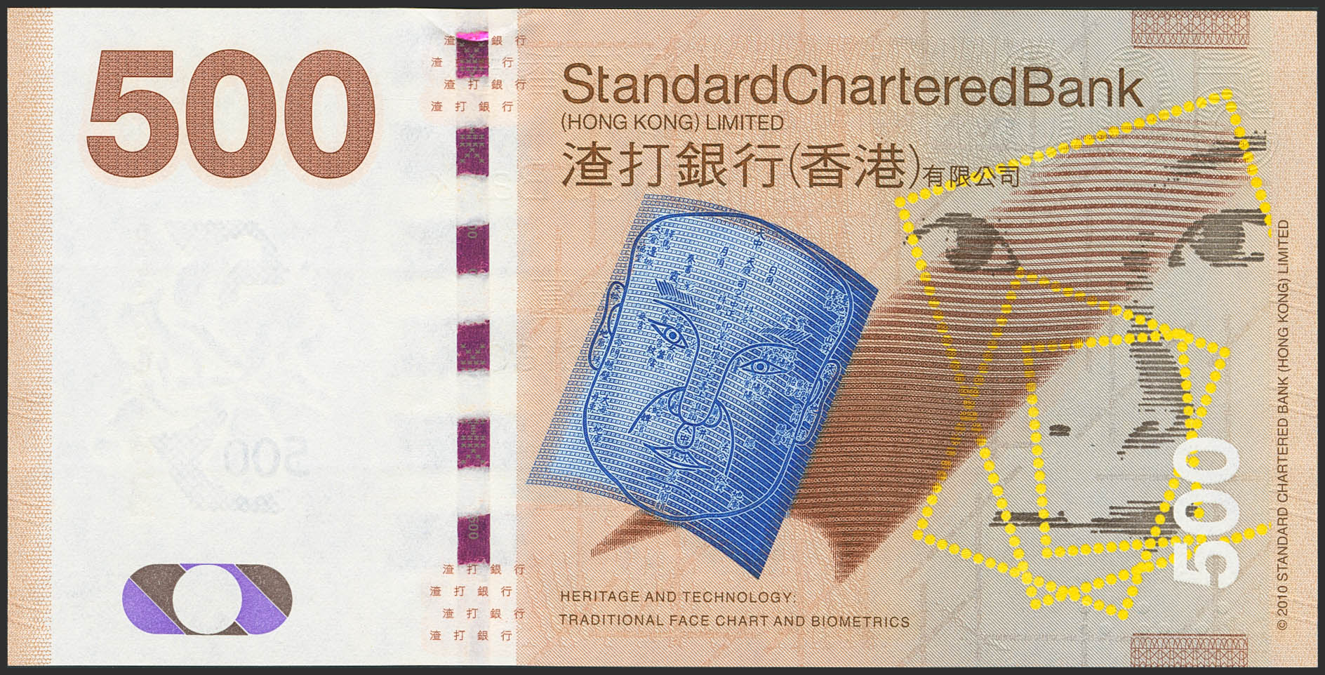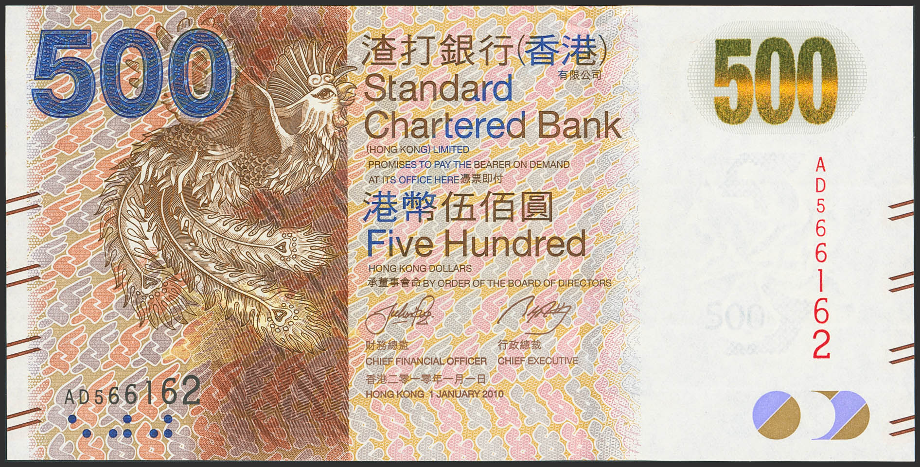 HONG KONG. 500 Dollars. 1 January 2010. Standard Chartered Bank. (Pick: 300a). Horizontal marks from the printing press roller. Less than Uncirculated.