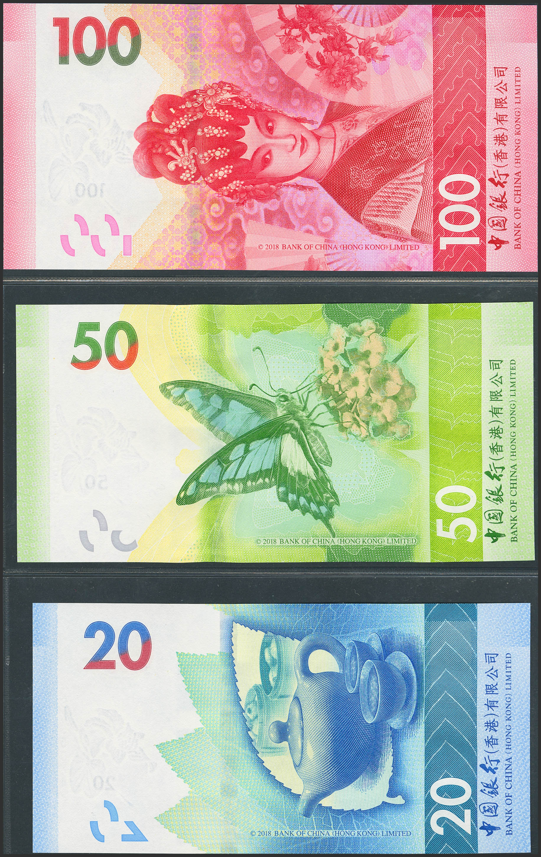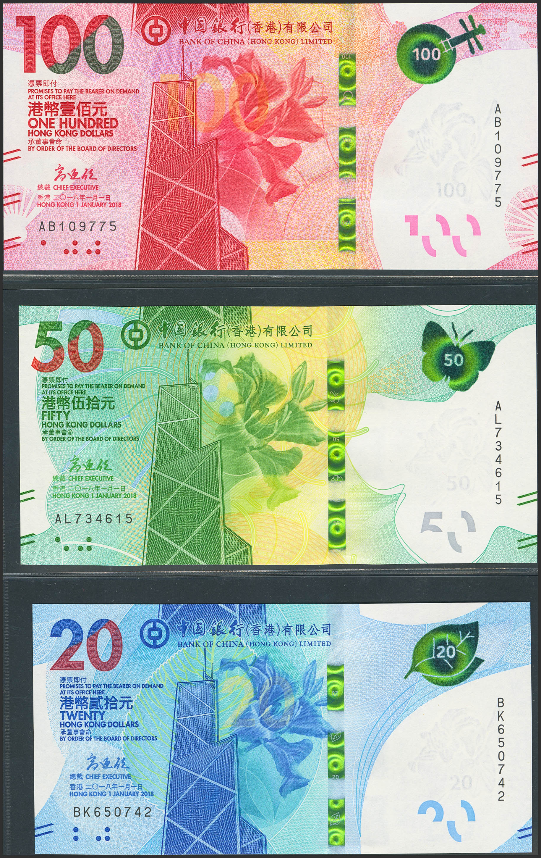 HONG KONG. Lot of 3 notes of 20, 50 and 100 Dollars. 1 January 2018. Bank of China. (Pick: 348a, 349a, 350a). Uncirculated.