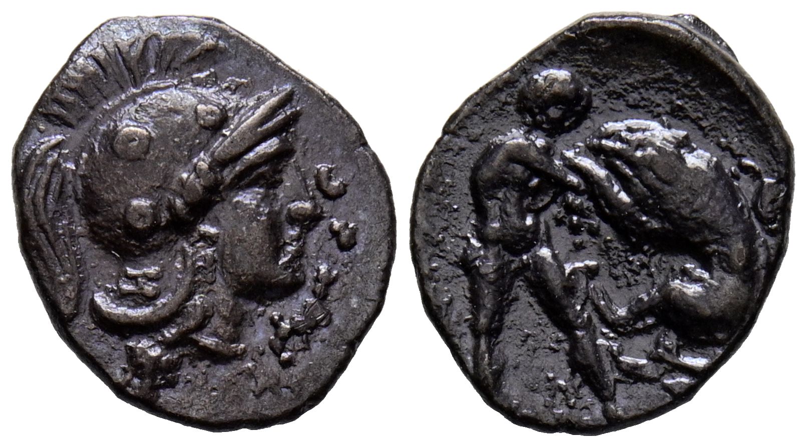 CALABRIA, Taranto. Diobolus. (Ar. 0.87g/12mm). 280-228 Fine (HN Italy 1061; Vlasto 1400-1412). Obv: Head of Athena wearing a crested helmet decorated with three roundels, on the neck H. Rev: Heracles wrestling with a lion. VF. Dark patina.