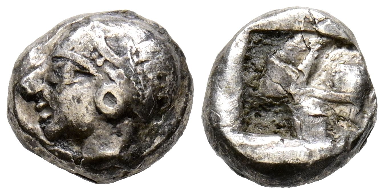 IONIA, Phokaia. Obolo. (Ar. 1.10g/10mm). 521-478 Fine (SNG von Aulock 1813/5). Obv: Female head with head turned left. Rev: Quadripartite incuse. VF.
