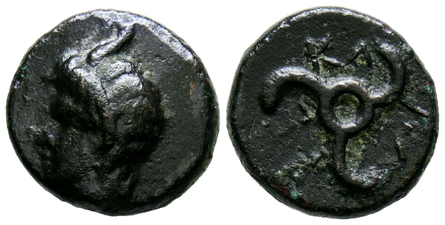 LYCIA DYNASTIES, Pericles. Ae12. (Ae. 2.08g/12mm). 380-360 Fine. Uncertain mint. (SNG von Aulock 4257-8). Obv: Head of Pan left. Rev: Triskeles, Greek legend around. VF.