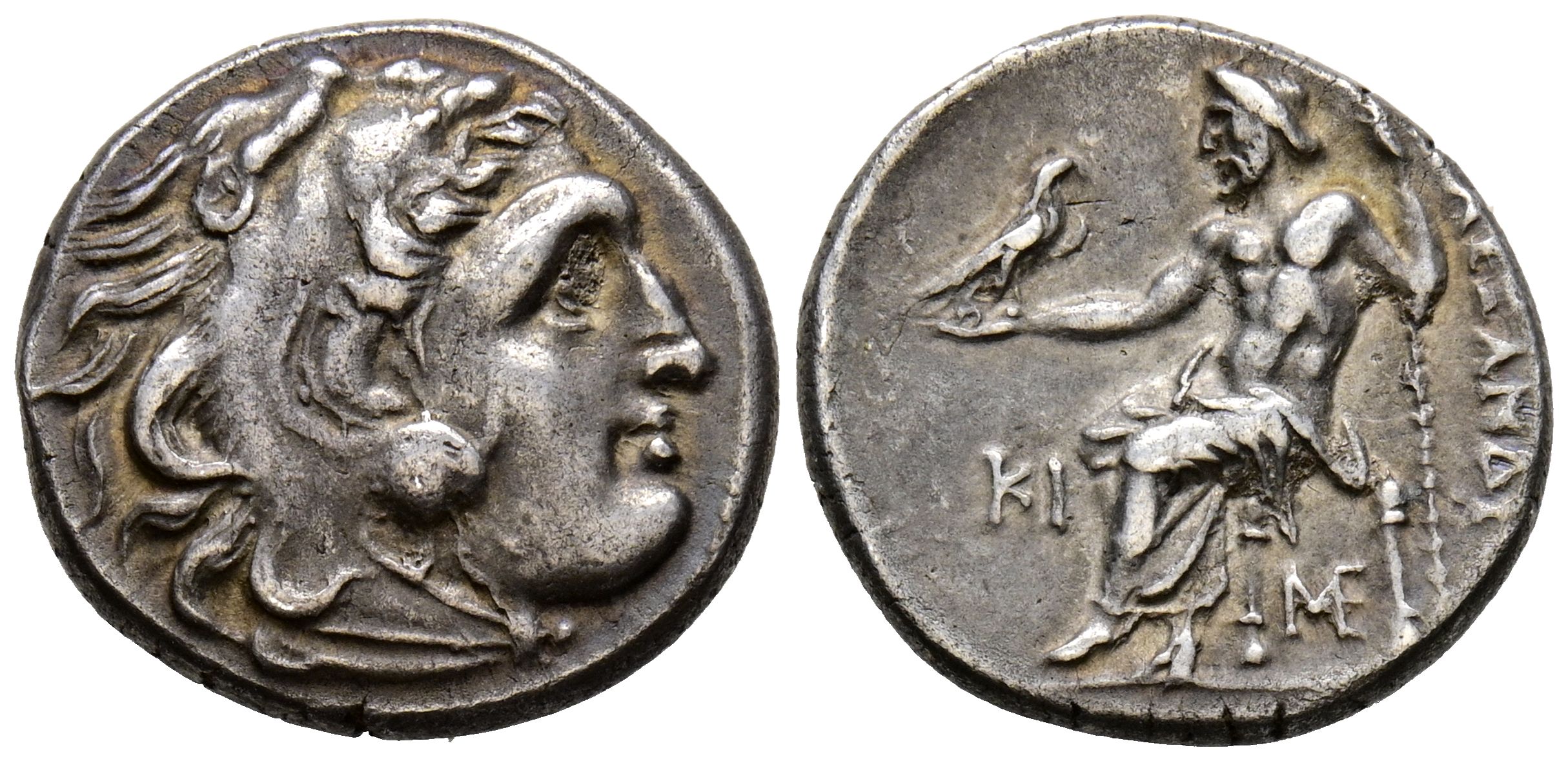 English KINGS OF MACEDONIA, Alexander III the Great. Drachma. (Ar. 4.19g/17mm). 336-323 Fine Lampsacos. (Price 1406). Obv: Head of Heracles with lion skin right. Rev: Zeus seated left holding sceptre and eagle, in front monogram: KI, below the throne monogram ME, behind legend: AΛΕΞΑΝΔΡΟΥ. VF+.