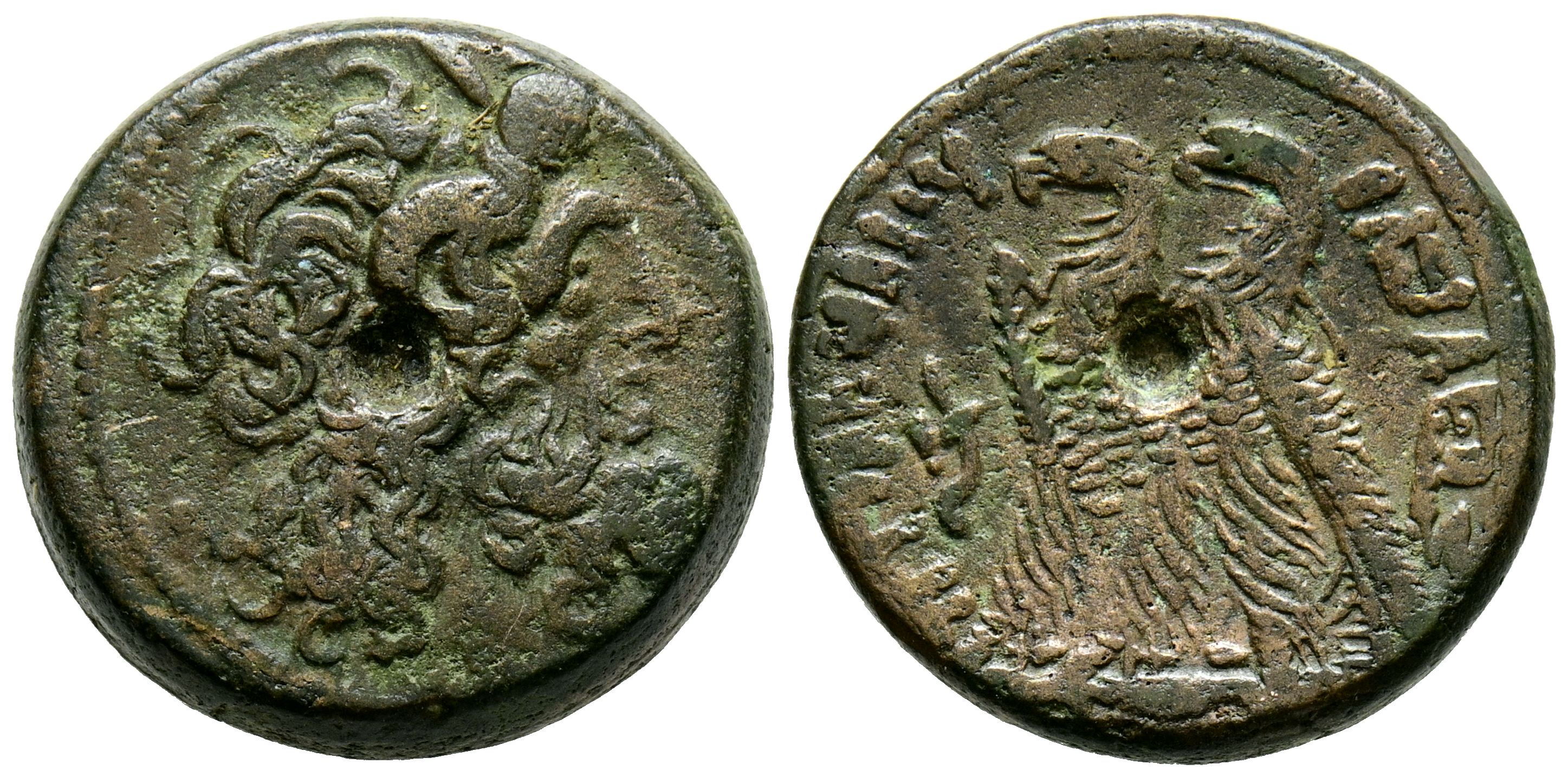 PTOLEMAIC KINGDOM, times of Cleopatra III and Ptolemy IX to Ptolemy XII. Ae19. (Ae. 8.82g/20mm). 116-51 Fine Alexandria. (Svoronos 1426; SNG Copenhagen 311/4). Obv: Head of diademed Zeus-Ammon right. Reverse: Two eagles standing left on thunderbolt and cornucopia left, around Greek legend: ΠΤΟΛΕΜΑΙΟΥ ΒΑΣΙΛΕΩΣ. VF+.