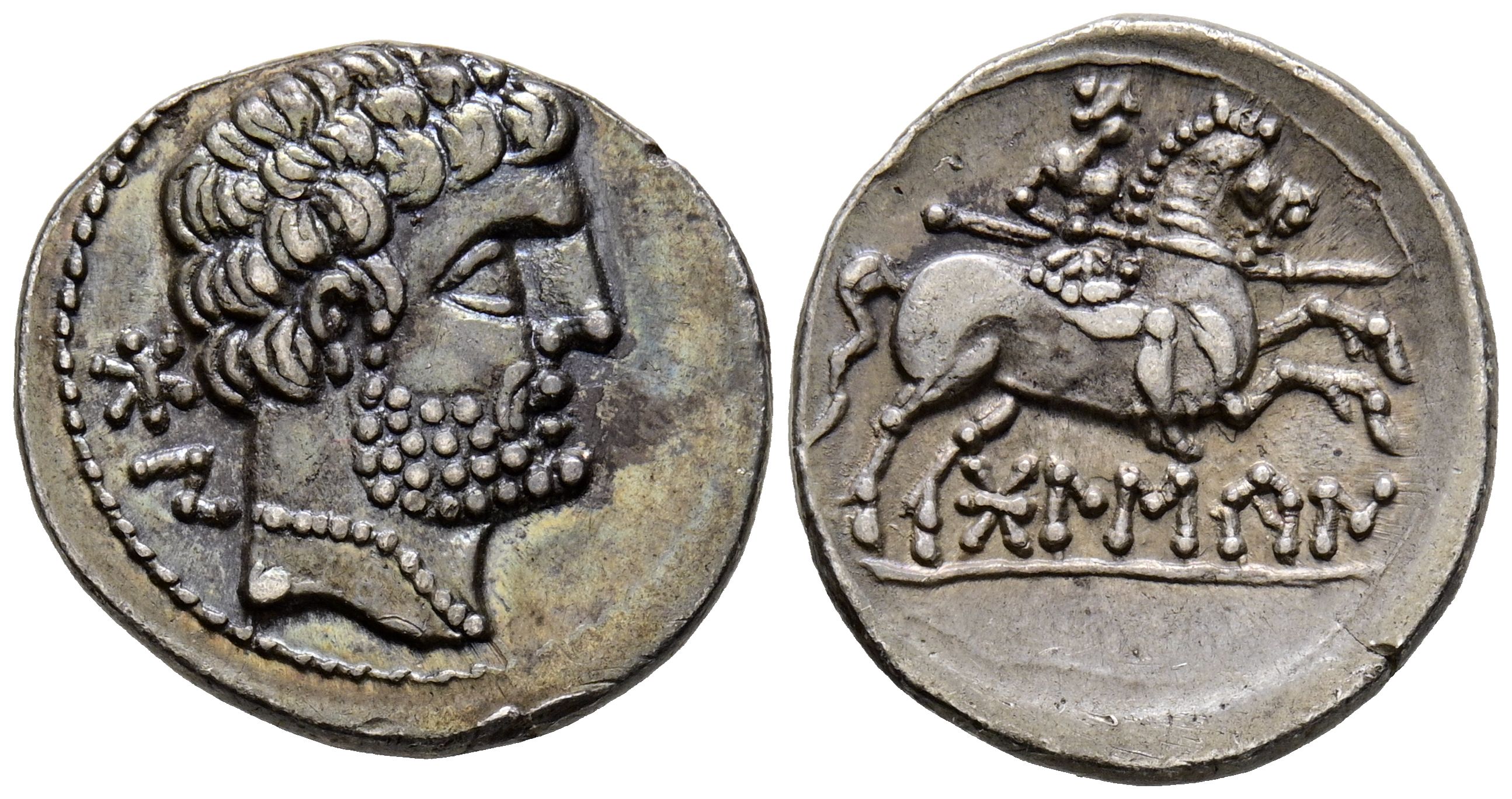 BOLUncirculatedAN (Huesca). Denarius. (Ar. 3.80g/18mm). 180-20 Fine (FAB-1911). Obv: Bearded male head to right, behind Iberian letters: BoN. Rev: Horseman with lance to right, below Iberian legend: BoLUncirculatedaN. Good Extremely Fine/Extremely Fine. Slight iridescent tone on obverse. Beautiful specimen, rare as it is.