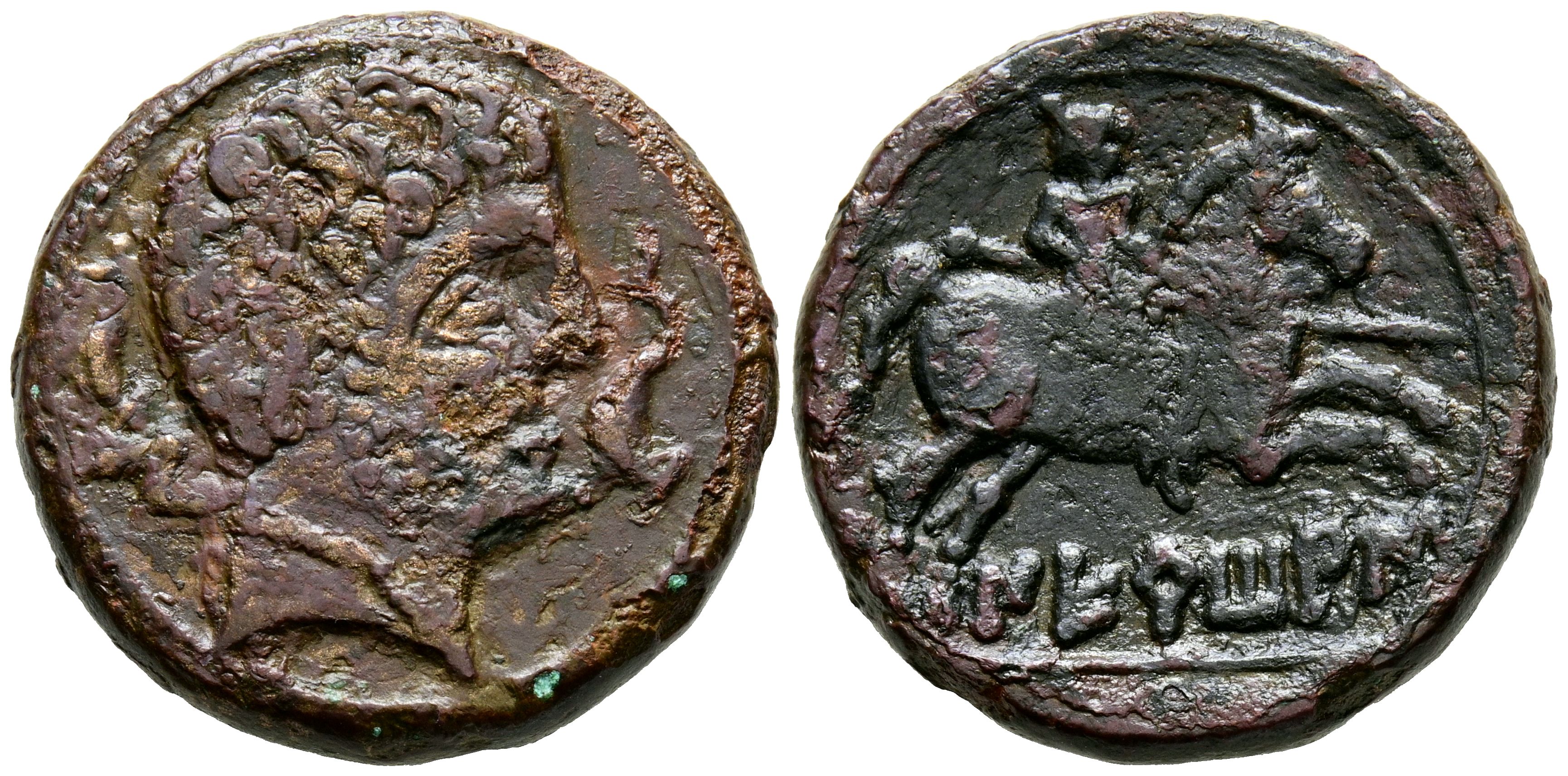 NERTOBIS (Calatorao, Zaragoza). As. (Ae. 10.47g/24mm). 120-20 Fine (FAB-1771). Obverse: Male head facing right between two dolphins, behind Iberian letter N. Reverse: Horseman with lance facing right, below Iberian legend: NERToBiS. VF-.