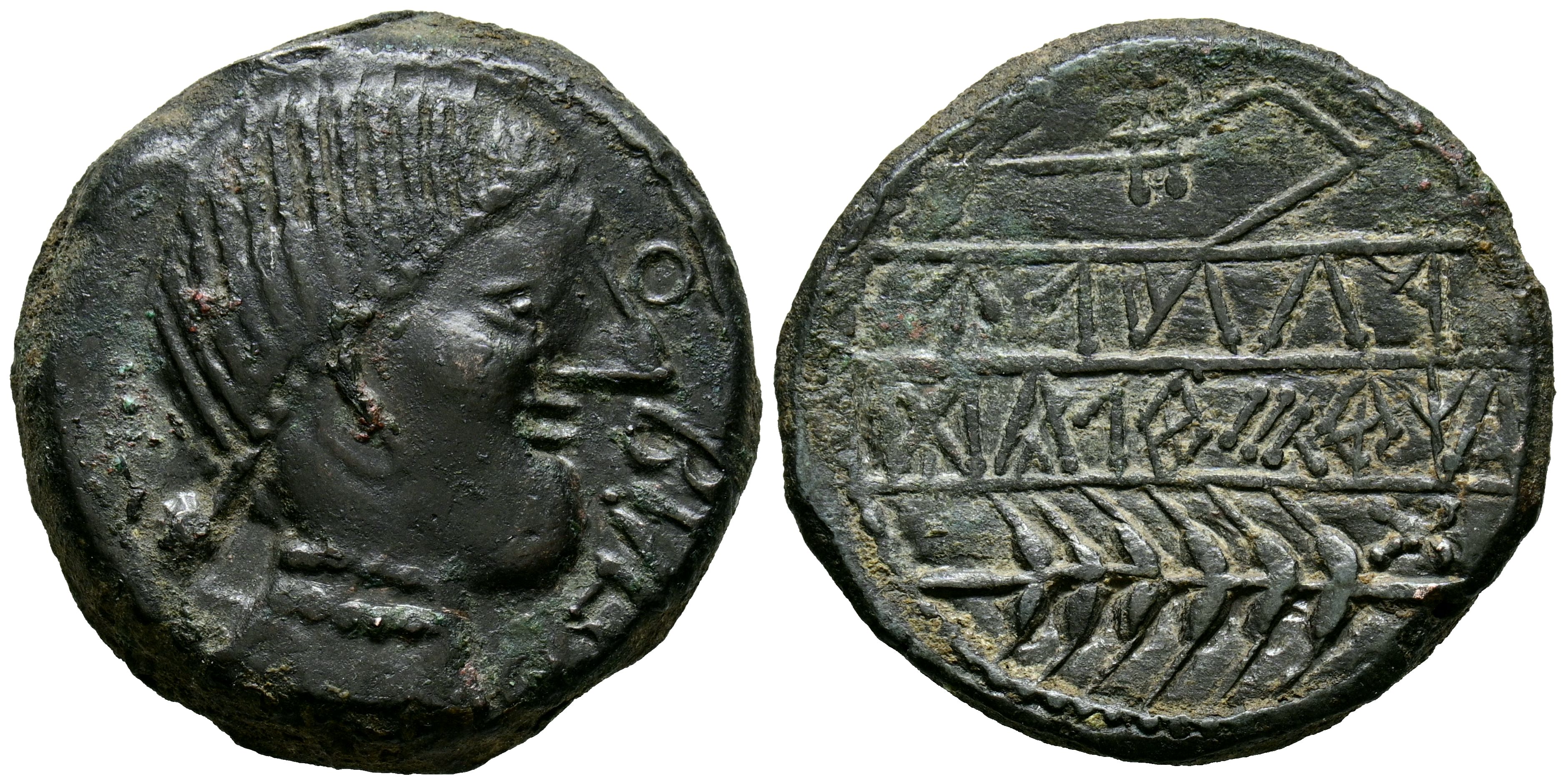 OBULCO (Porcuna, Jaén). As. (Ae. 13.64g/26mm). 220-20 Fine (FAB-1791). Obv: Female head right, in front legend: OBVLCO. Rev: Ear of wheat right, below ear of wheat left, between them legend: OGoodaILV/NTuSTuLDuCo, letter: Ta above ear of wheat. VF+. Interesting specimen.