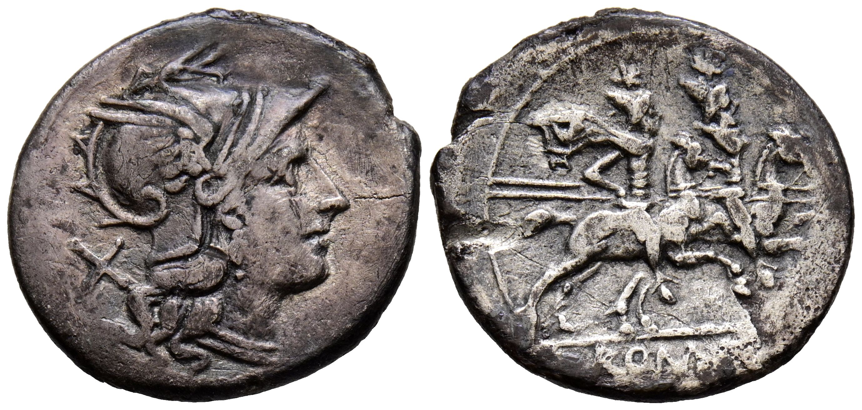 ANONYMOUS MINNIES. Denarius. (Ar. 3.26g/20mm). 200-190 Fine South Italy. (FFC 7; Crawford 44/5). Obv: Head of Roma with helmet right, behind X. Rev: Dioscuri on horseback with lance right, above both stars, in exergue: ROMA. VF-.