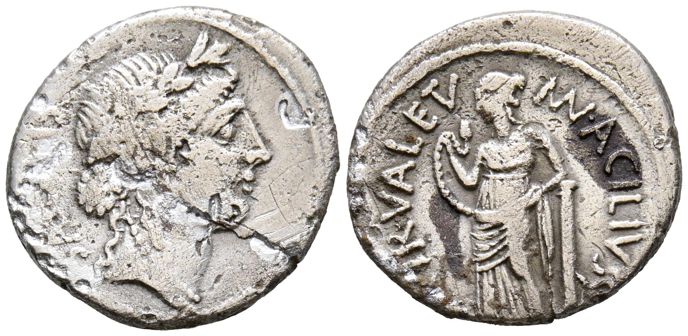 GENS ACILIA. Denarius. (Ar. 3.49g/20mm). 55 Fine Rome. (FFC 96; Crawford 442/1a). Obv: Laureate head of Salus right, behind legend: SALVTIS. Rev: Salus standing left leaning on column and snake, around legend: MN ACILIVS III VIR VALETV. Good Fine/Very Fine-.