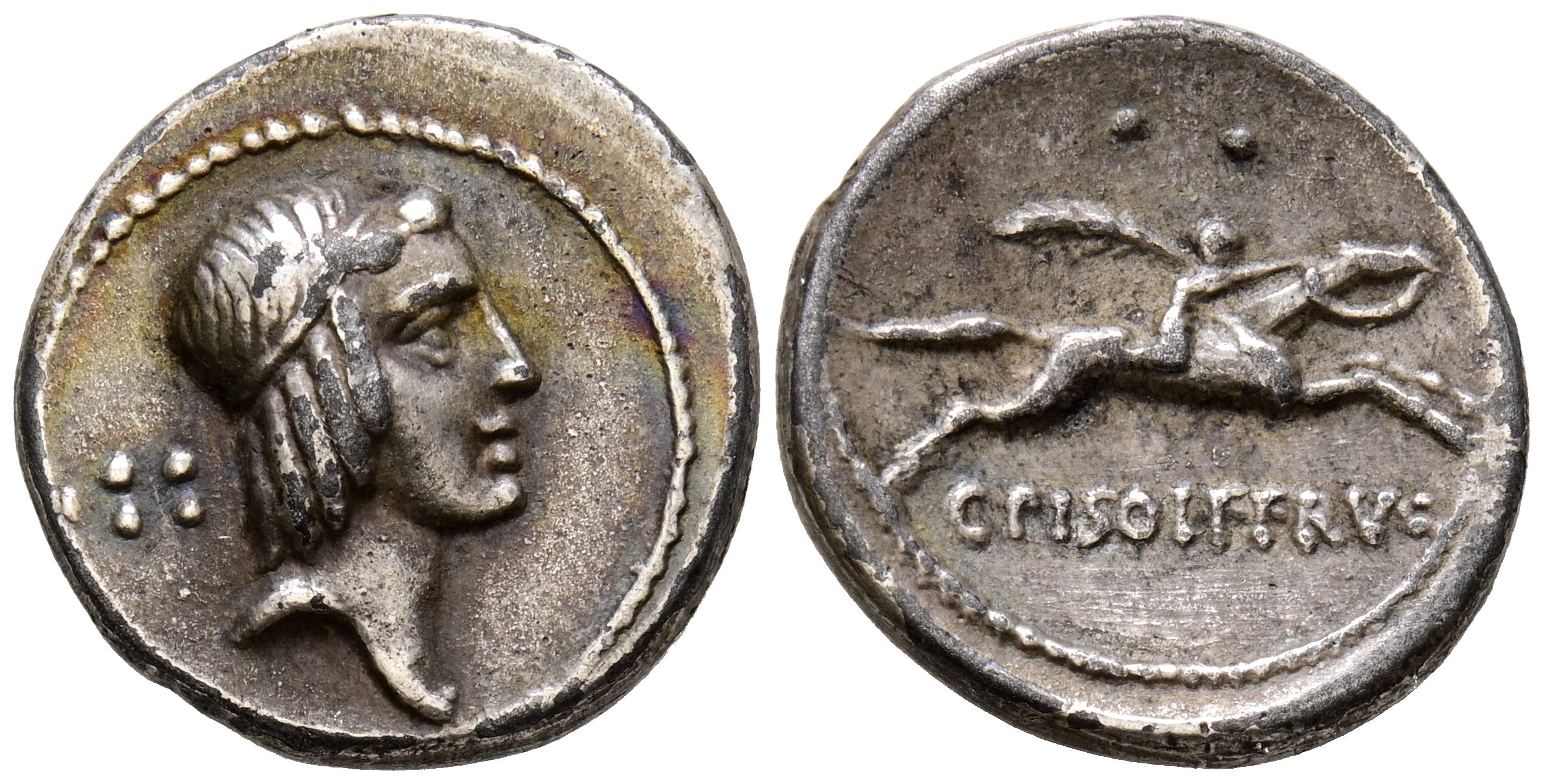 GENS CALPURNIA. Denarius. (Ar. 3.24g/19mm). 90-89 Fine Rome. (Crawford 340/1). Obv: Head of Apollo right, behind four dots. Reverse: Rider with palm-bearer galloping right, above two dots, below legend: C FLOOR L FRVGI. VF+.