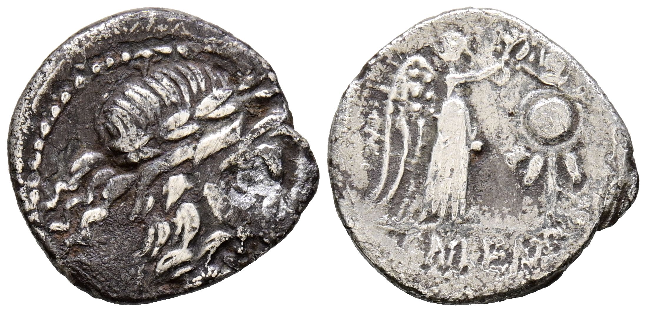 GENS CORNELIA. Quinarius. (Ar. 1.69g/15mm). 88 Fine Rome. (Crawford 345/2). Obv: Laureate head of Jupiter right. Rev: Standing Victory crowning shield right, below legend: CN LENT. Very Fine-.