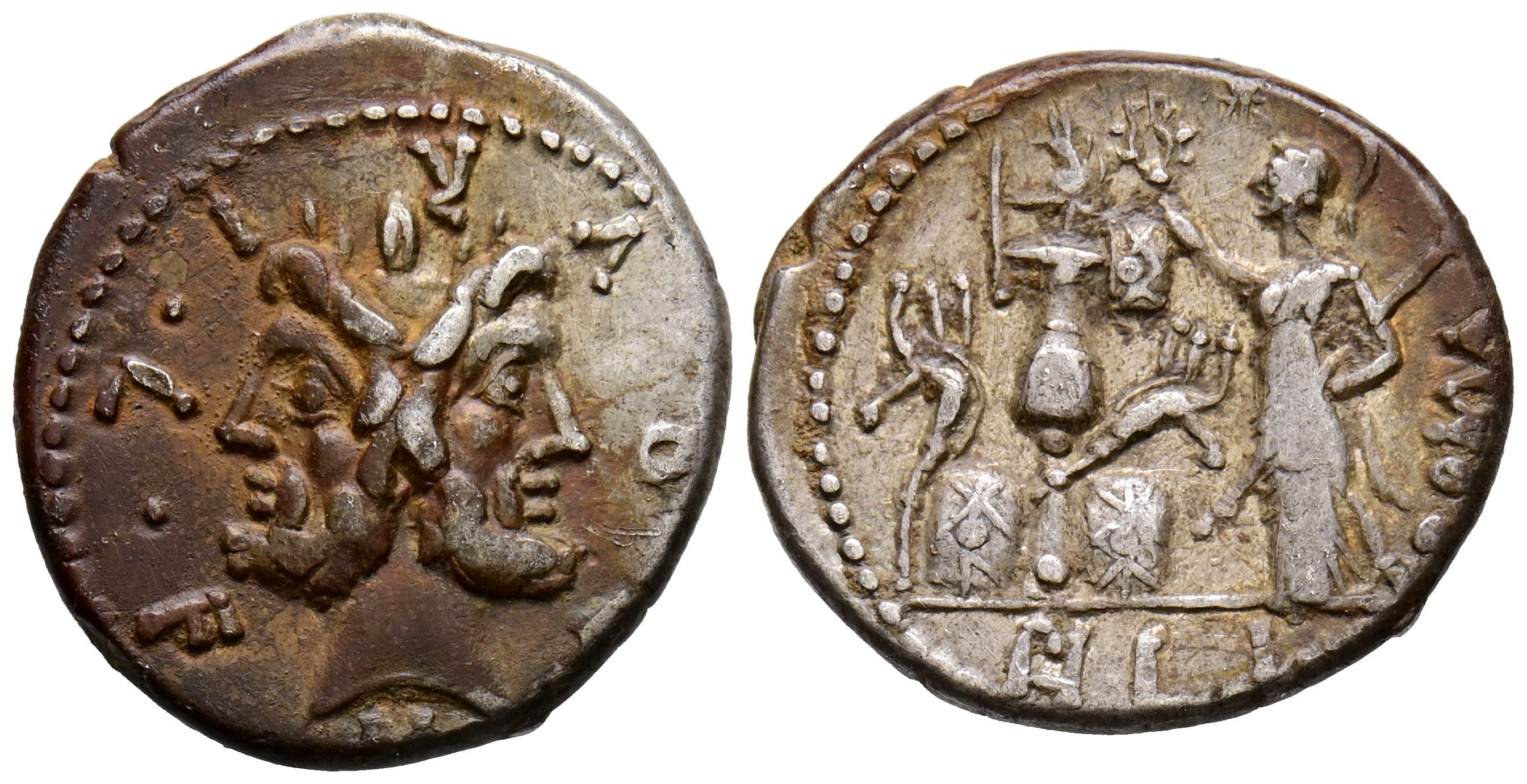 GENS FURIA. Denarius. (Ar. 3.93g/19mm). 119 Fine Central Italy. (FFC 730; Crawford 281/1). Obv: Double-faced head of Janus, around legend: M FOVRI LF. Rev: Roma standing on the left crowning a trophy, between two shields and two carnyx, on the right legend: ROMA, in exergue: PHILI. VF+.