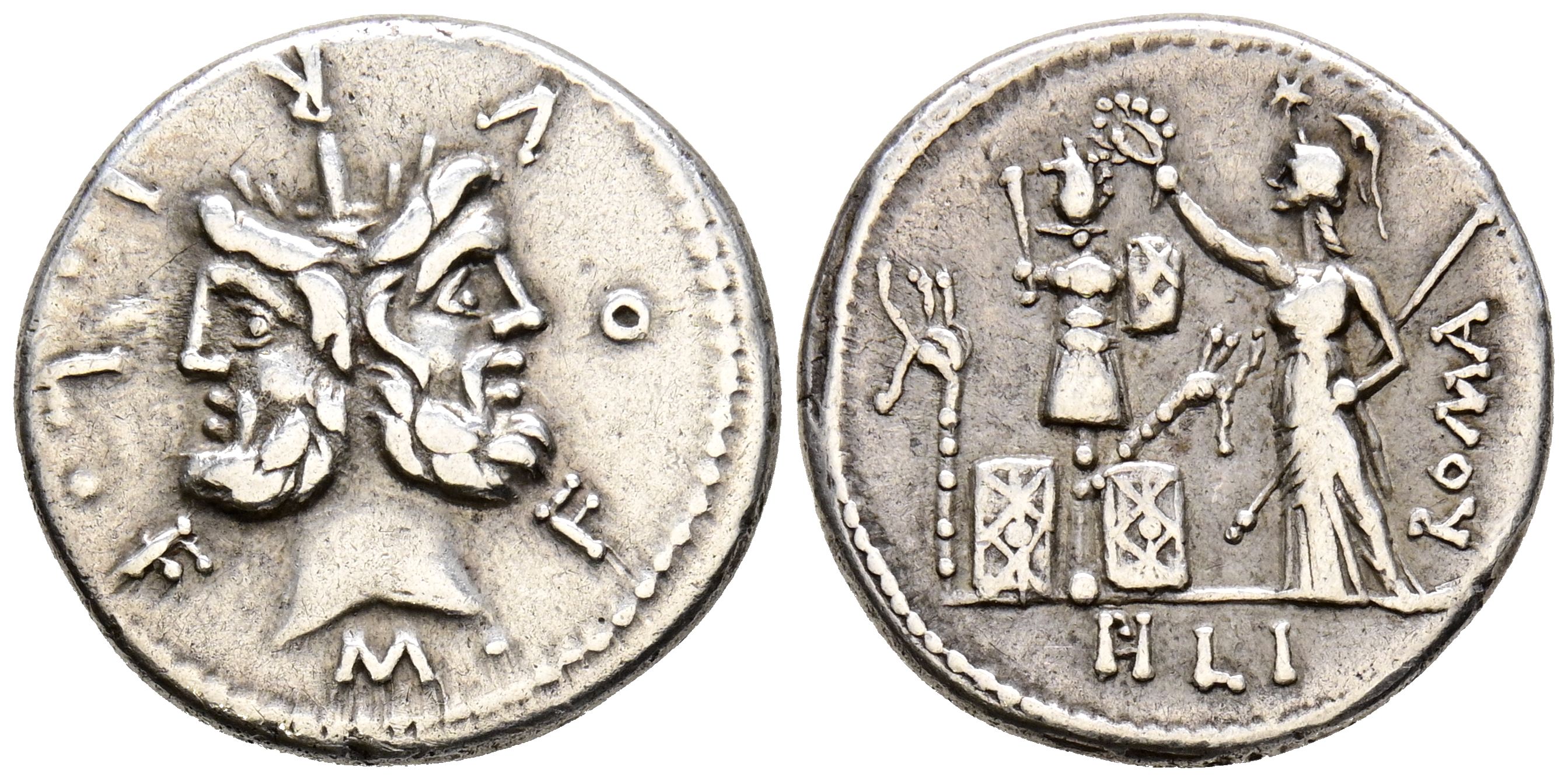 GENS FURIA. Denarius. (Ar. 3.89g/19mm). 119 Fine Central Italy. (Crawford 281/1; FFC 730). Obv: Double-faced head of Janus, around legend: M FOVRI LF. Rev: Roma standing on the left crowning a trophy, between two shields and two carnyx, on the right legend: ROMA, in exergue: PHILI. Very Fine.