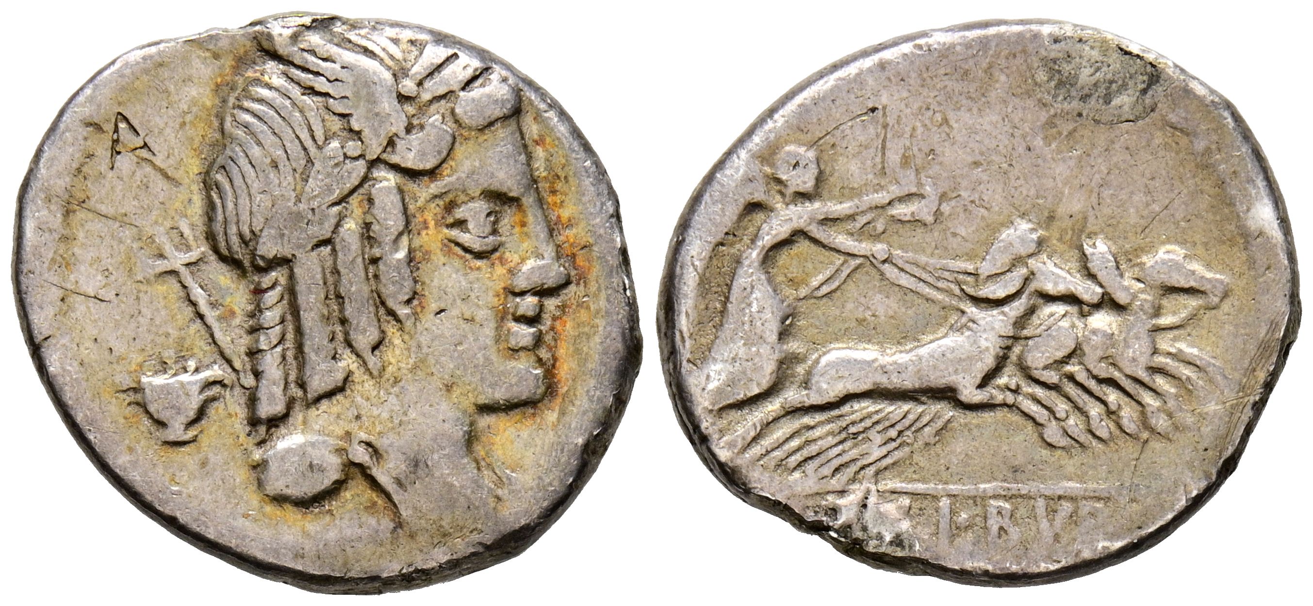 GENS JULIA. Denarius. (Ar. 3.78g/19mm). 85 Fine. Auxiliary workshop of Rome. (FFC 767; Crawford 352/1a). Obv: Laureate and winged head of Apollo right, trident and symbol behind. Reverse: Victory with laurel wreath on quadriga right, in exergue: L IVLI BVRSIO. Very Fine-.