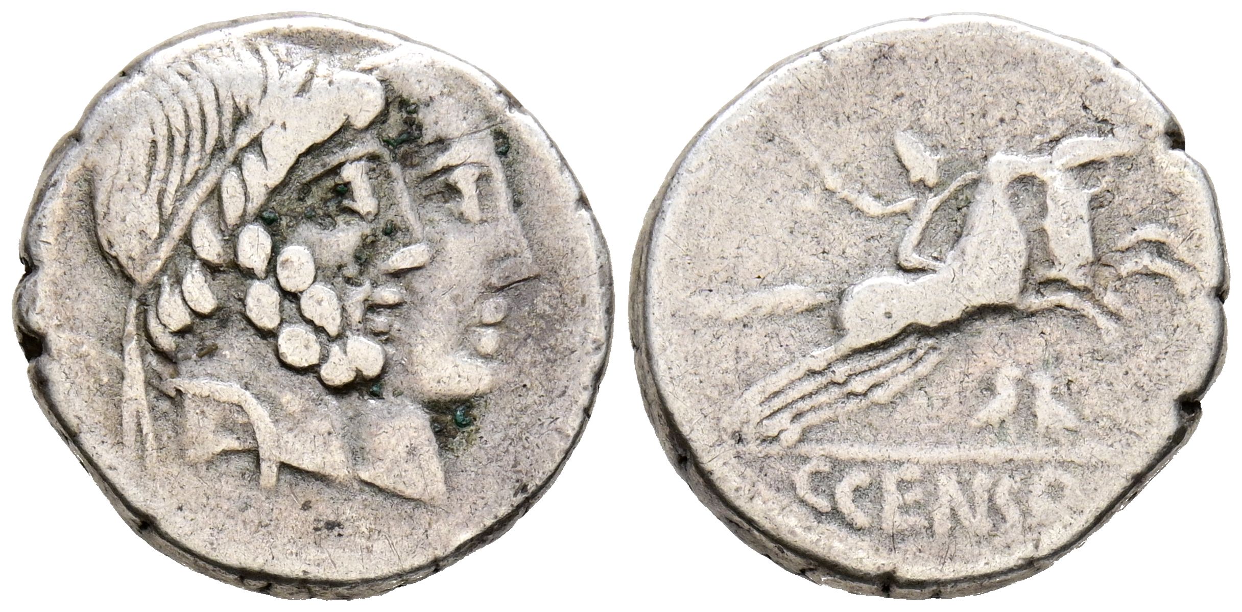 GENS MAGoodIA. Denarius. (Ar. 3.76g/17mm). 88 Fine Uncertain mintage. (FFC -859; Crawford 346/1b). Obv: Diademed heads of Numa Pompilius and Ancus Marcius right. Reverse: Horseman with whip right leading a second horse, below two facing owls, in exergue: C CENSUS. VF-.