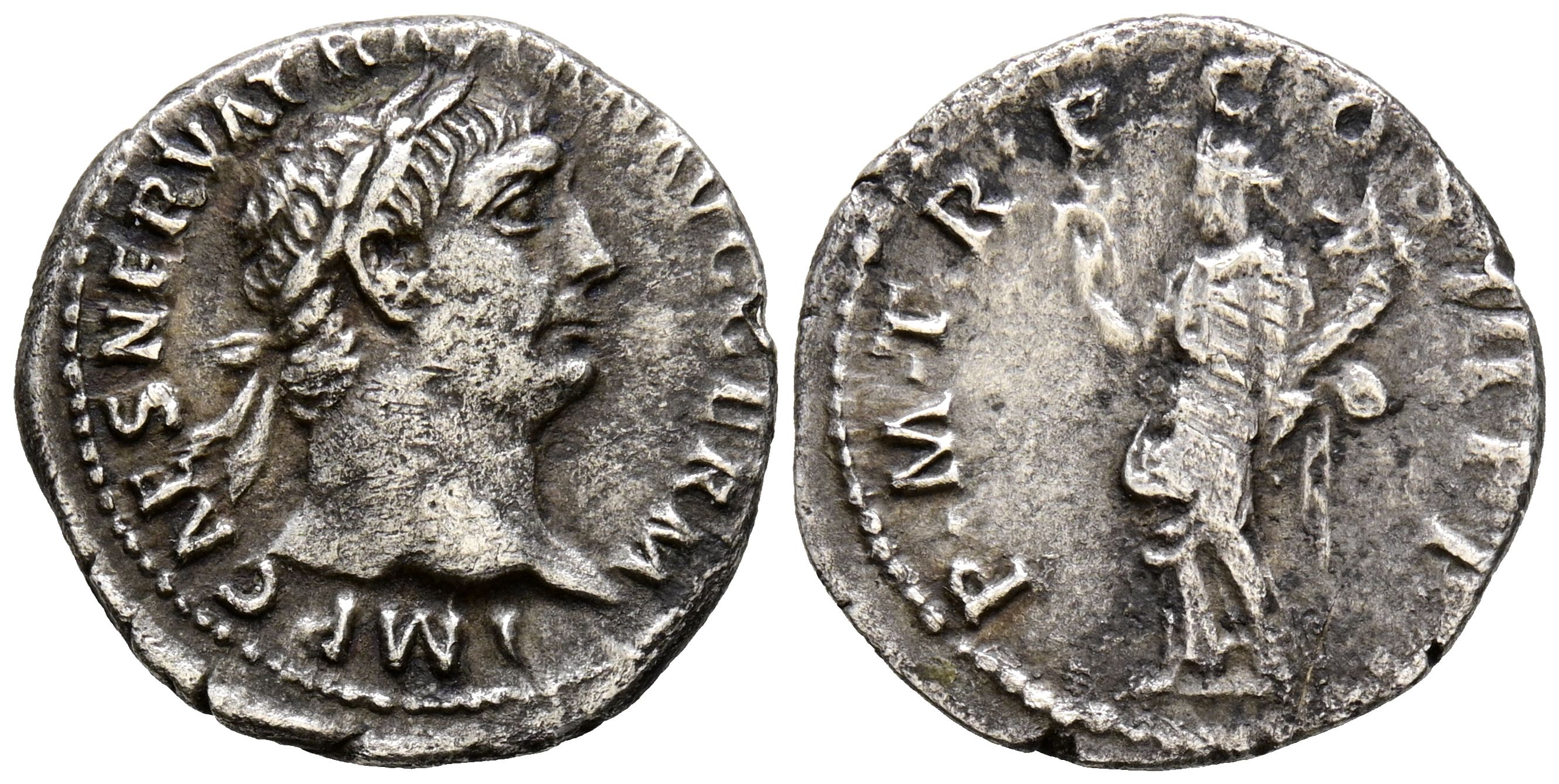 TRAJAN. Denarius. (Ar. 2.87g/19mm). 98-99 AD Rome. (RIC 6). Obv: Laureate head of Trajan facing right, around legend: IMP CAES NERVA TRAIAN AVG GERM. Rev: Felicitas standing left carrying laurel wreath and cornucopia, around legend: PM TR P COS II P P. Very Fine/Very Fine-.