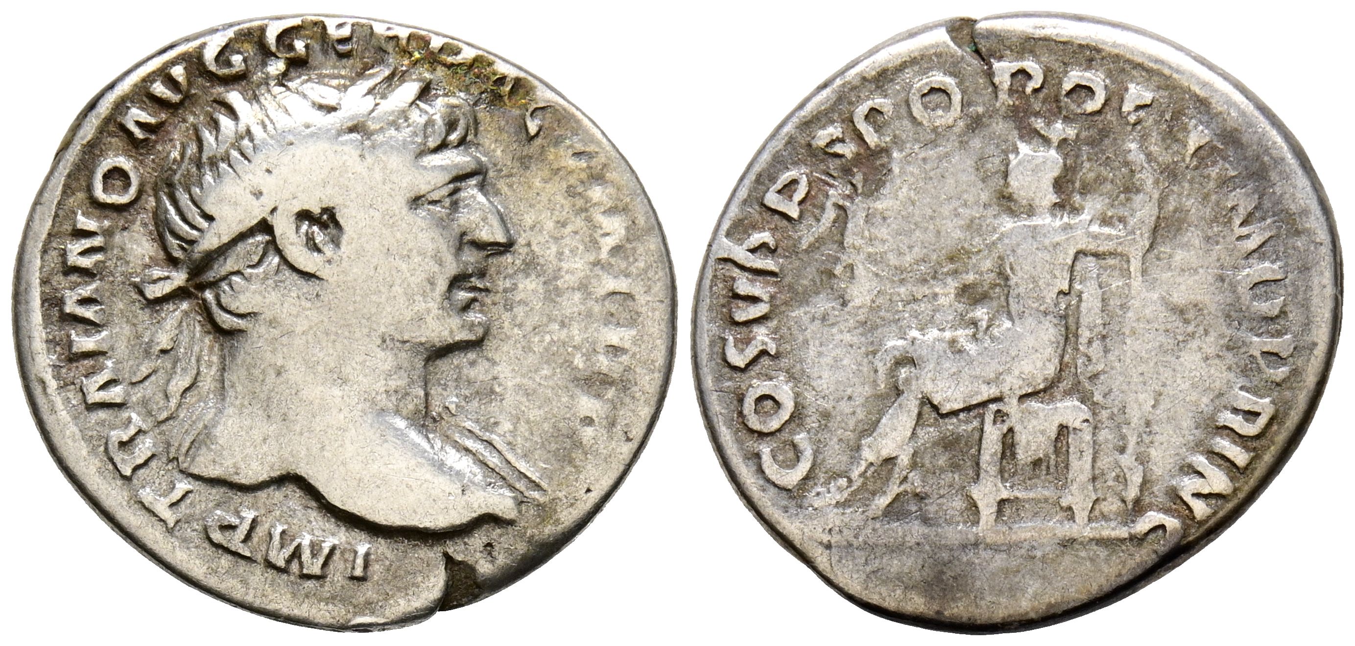 TRAJAN. Denarius. (Ar. 3.40g/20mm). 108-109 AD Rome. (RIC 116). Obv: Laureate head of Trajan right, around legend: IMP TRAIANO AVG GER DAC PM TR P. Rev: Roma seated left holding lance and carrying Victory with laurel wreath, around legend: COS VPP SPQR OPTIMO PRINC. Very Fine.