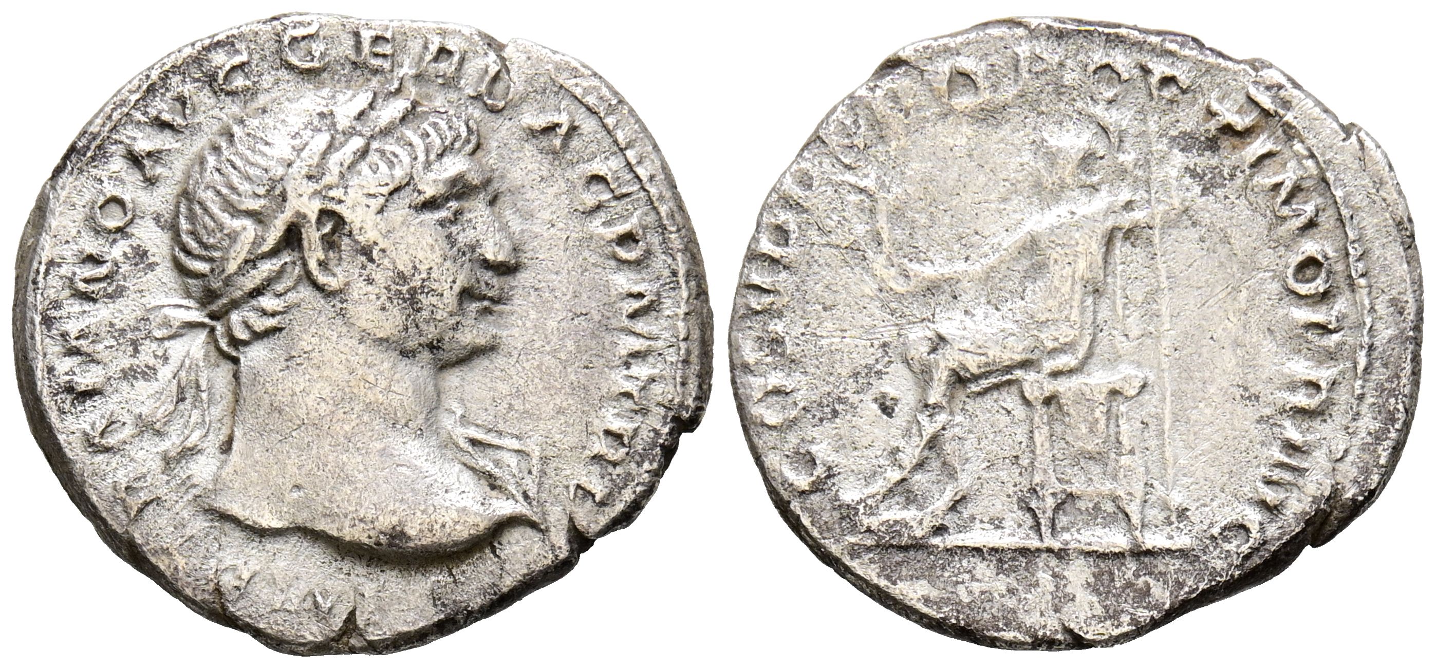 TRAJAN. Denarius. (Ar. 3.48g/19mm). 103-112 AD Rome. (RIC 119). Obv: Laureate head of Trajan facing right with light draping over left shoulder, surrounding legend: IMP TRAIANO AVG GER DAC PM TR P. Rev: Aequitas seated left with scales and cornucopia, surrounding legend: COS VPP SPQR OPTIMO PRINC. Very Fine.