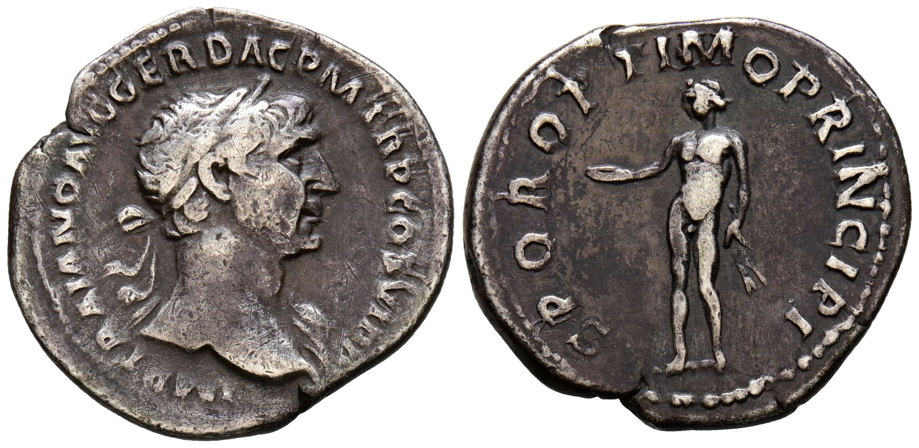 TRAJAN. Denarius. (Ar. 3.13g/21mm). 112-114 AD Rome. (RIC 276). Obv: Laureate bust of Trajan facing right with drapery over left shoulder, legend all around: IMP TRAIANO AVG GER DAC PM TR P COS VI P P. Rev: Genius standing left carrying patera and wheat ears, legend all around: SPQR OPTIMO PRINCIPI. Very Fine.