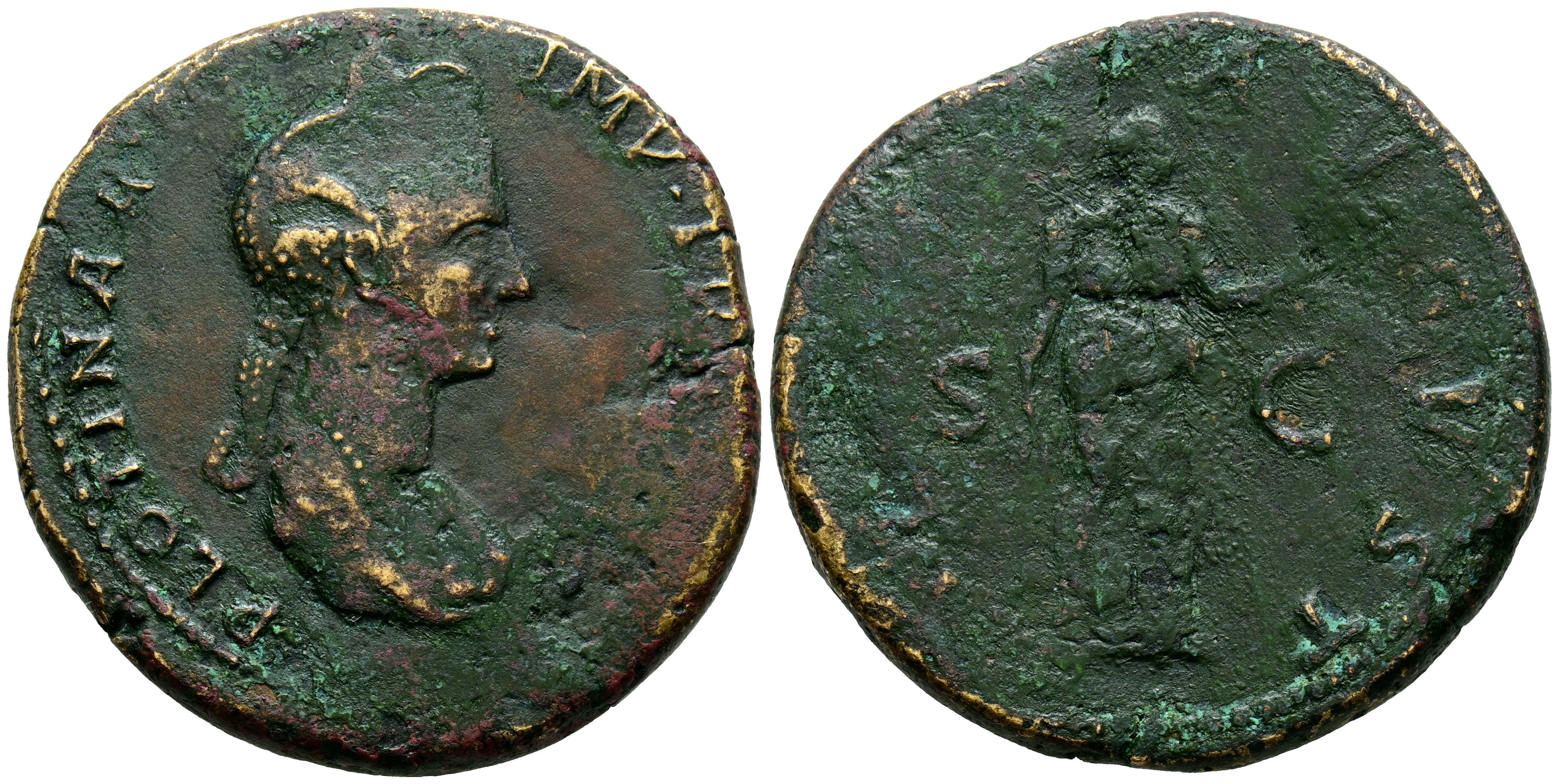 English PLOTINA. Sestertius. (Ar. 23.10g/35mm). 112-117 AD Rome. (RIC 740). Ob.: Diademed and draped bust of Plotina facing right, around legend: PLOTINA AVG IMP TRAIANI. Rev.: Fides with ears of wheat and basket of fruit, between: Uncirculated, around legend: FIDES AVGVST. Good Fine. Cleaned. Very rare.