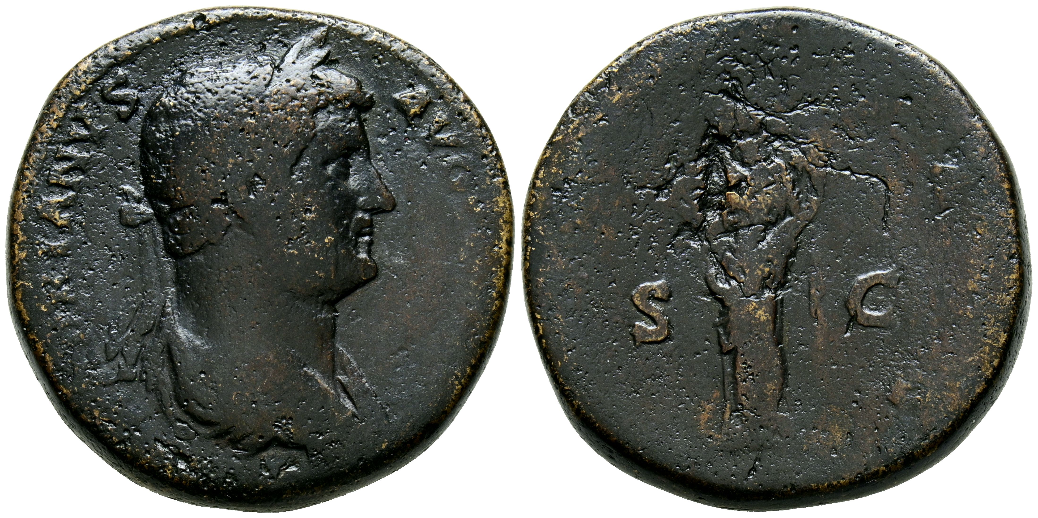 HADRIAN. Sestertius (24.76g/31mm). 135 AD Rome. (RIC 769). Obv: Laureate and draped bust of Hadrian facing right, around legend: HADRIANVS AVG COS III P P. Rev: Pax standing facing forward, holding cornucopia and olive branch, in field: Uncirculated, around legend: PAX AVG. Good Fine/Good.